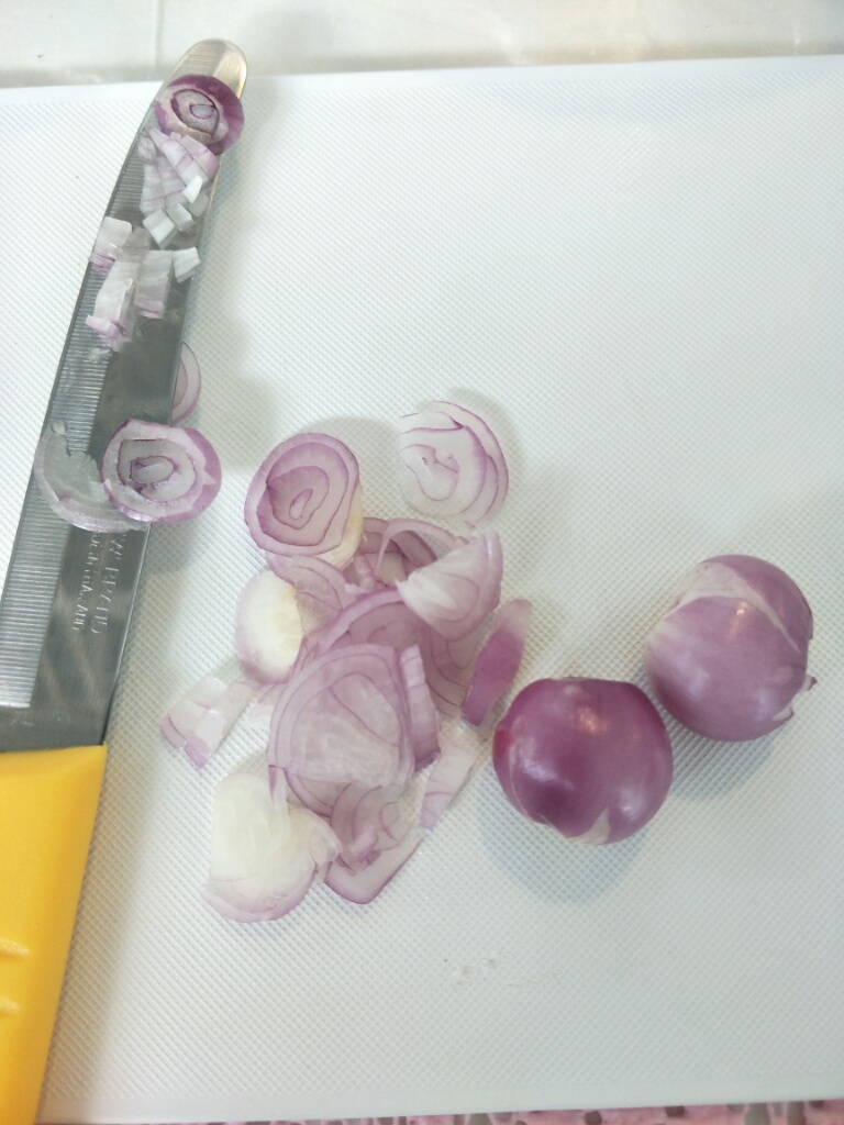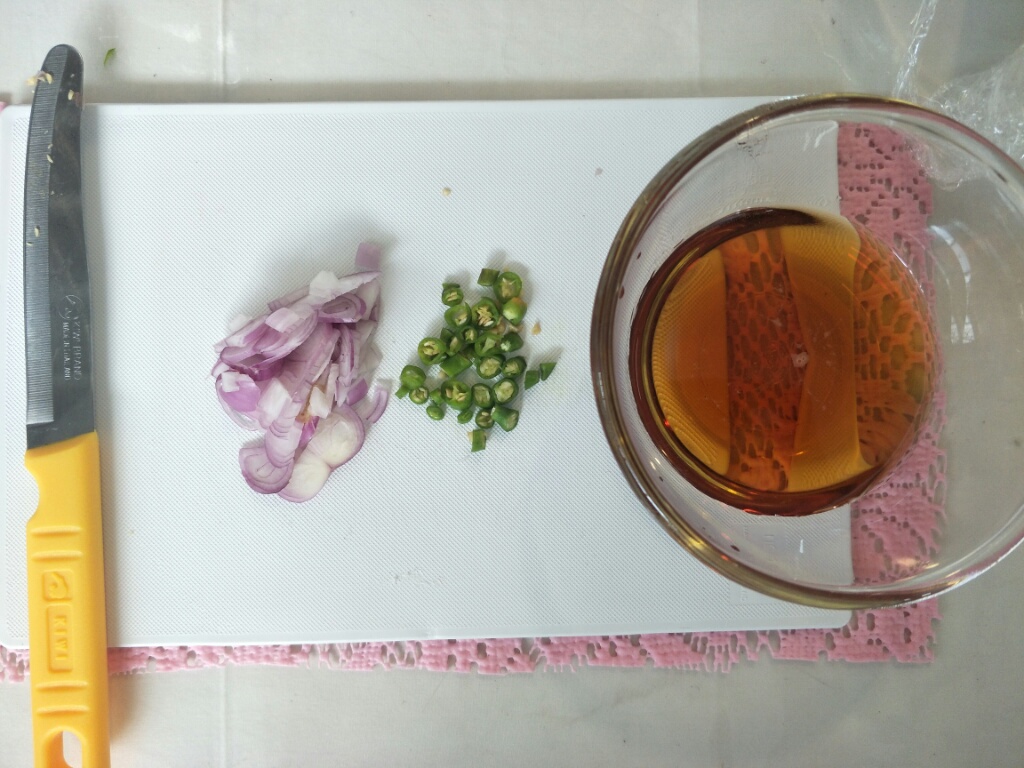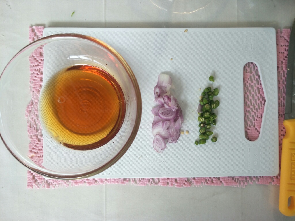 1. หั่นหอมแดงและพริกขี้หนู (ใส่ตามชอบเลยคะ)