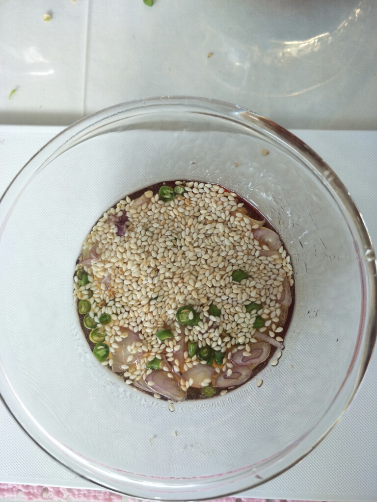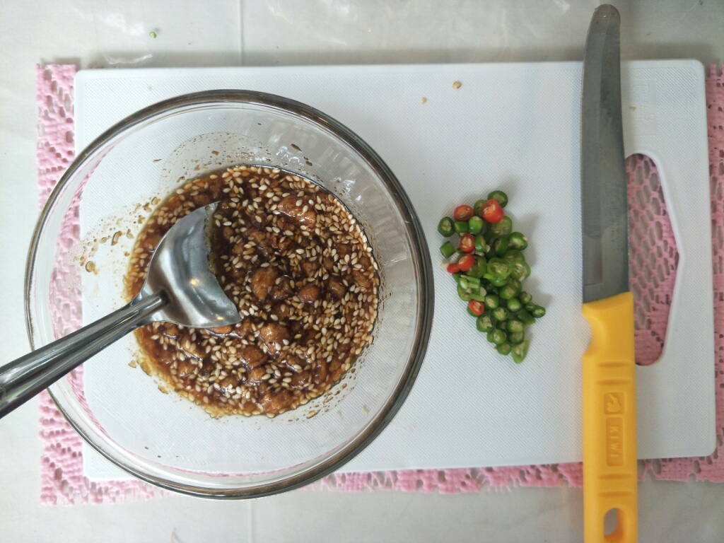 4. หั่นพริกขี้หนูใส่ลงในชามส่วนผสม (ใส่ตามชอบเลยคะ) ในสูตรนี้จะไม่ใส่หอมแดงนะคะ เพราะว่าหอมแดงมีกลิ่นฉุนเป็นผักที่งดทานในช่วงเจคะ