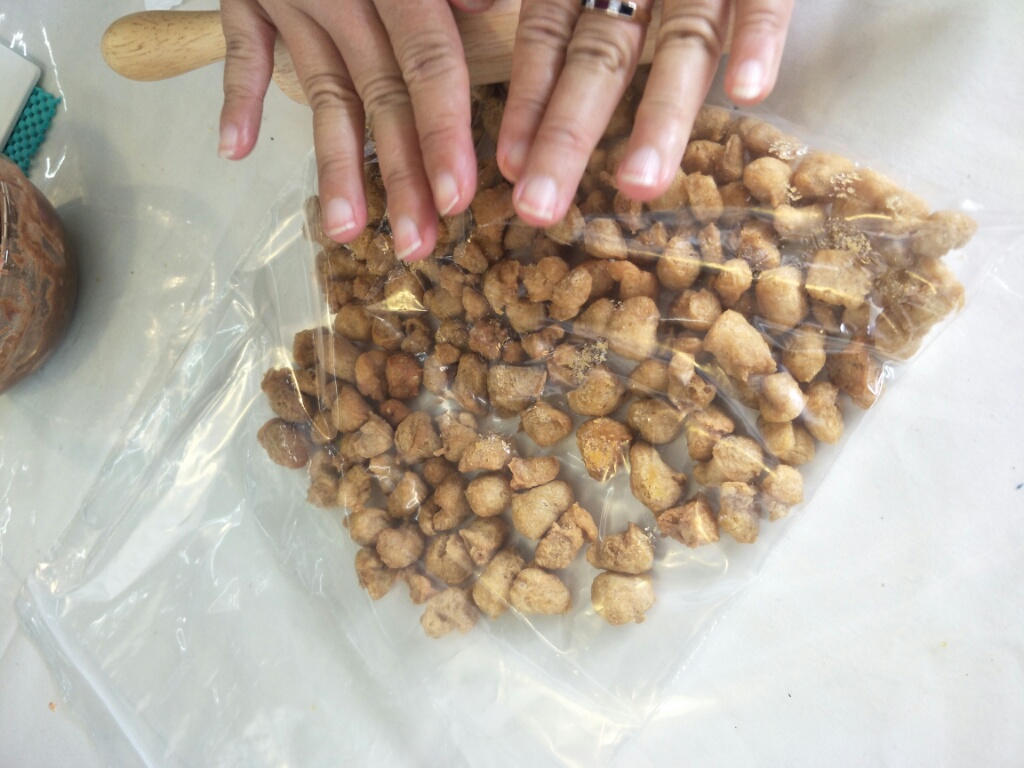 2. นำโปรตีนเกษตรลงไปคั่วไฟอ่อนๆ แล้วนำมาบดคะ