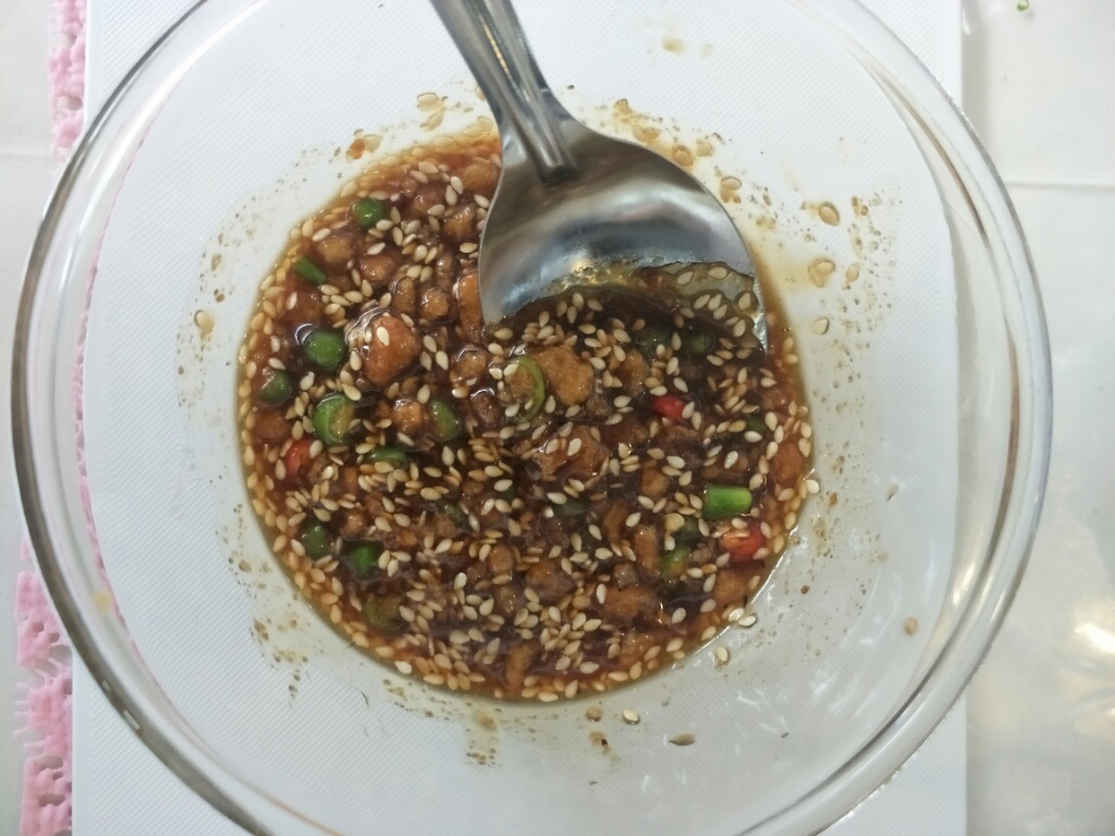 3. ใส่โปรตีนเกษตรบดและงาลงไป (ใส่ตามชอบเลยคะ)