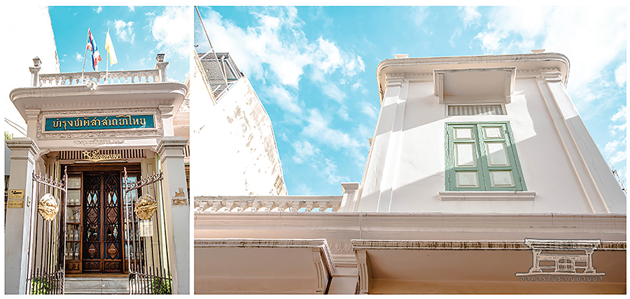 การใช้สีดั้งเดิมของอาคารเป็นสีขาวนวลเปลือกไข่ไก่ตัดกับป้ายอาคารสีเขียวไข่กา ตัวหนังสือและหัวสิงค์คาบดาปสีทองสว่างตัดกับสีไม้ธรรมชาติมันช่างลงตัวยิ่งนัก