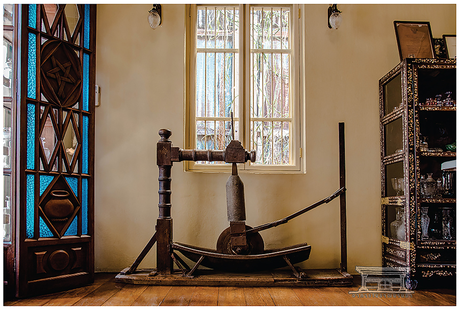 เครื่องบดยาโบราณที่ใช้งานคู่กับอาคารมาดั้งเดิมแต่โบราณแต่เดียวนี้ไม่ได้ใช้งานแล้ว