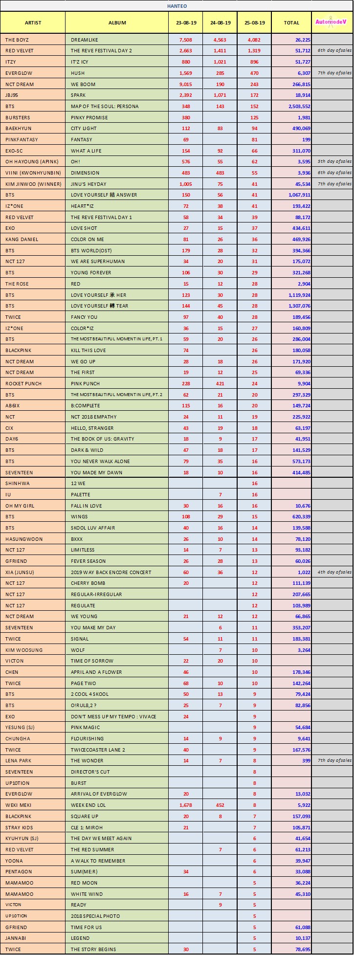 ยอดซื้ออัลบั้มจากชาร์ต HANTEO 23 - 25 สิงหาคม 2562
