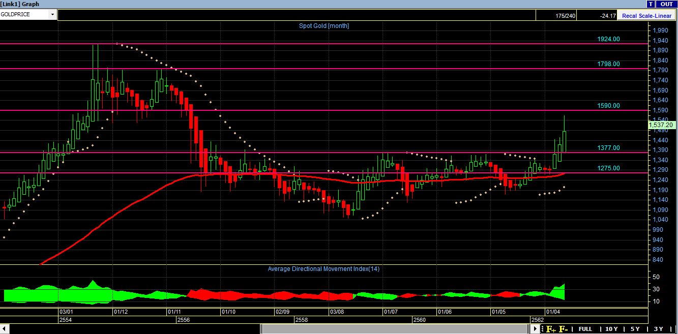 จากกราฟ TF Mouth จะเห็นได้ว่าทองคำ เป็นเทรนขาขึ้น(อ้างอิงจากสีเขียวของ ADX) โดยมีแนวรับแนวต้านดังนี้