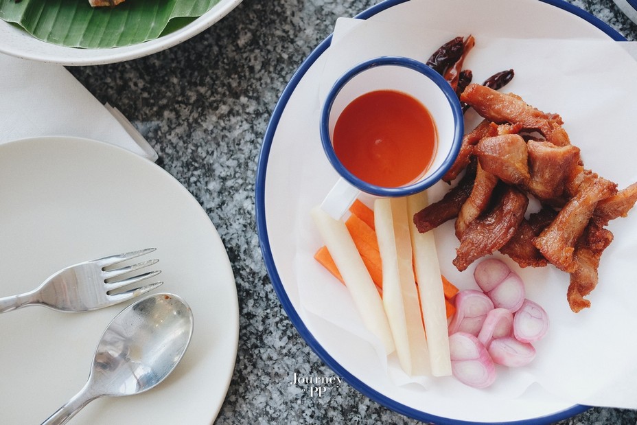 “สันคอหมูทอดน้ำปลา” อันนี้ดีมากกกกกก เป็นเนื้อสันคอ ติดมันมาหน่อยๆ หมักน้ำปลาทอด คือหมูมีรสเค็มกำลังดี หอมน้ำปลา จิ้มซอสพริก กินกับหอมแดงดอง คือสุดดดดด