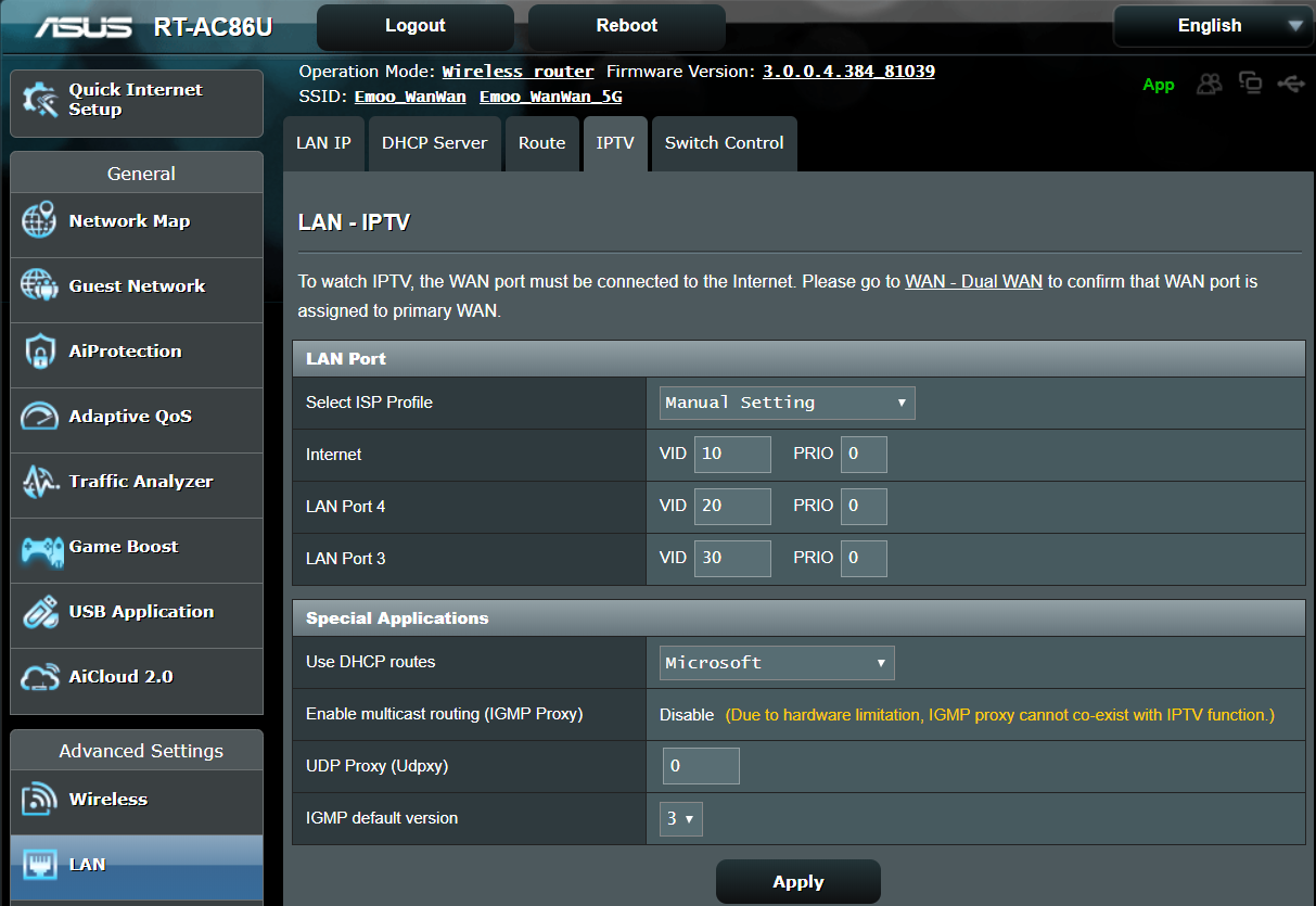 การตั้งค่าในส่วนนี้คือการตั้งค่า VLAN ในฝั่ง Internet ที่ผู้ให้บริการหรือ ISP อาจจะมีการแยก VLAN หรือการแยกท่อเชื่อมต่อให้เฉพาะกับบางอุปกรณ์เช่น IPTV เพื่อไม่ให้ไปแชร์กับเน็ตบ้านการตั้งค่าก็คือใส่ค่า VLAN ID ที่ทาง ISP กำหนดลงในช่องแลน 3 หรือ 4