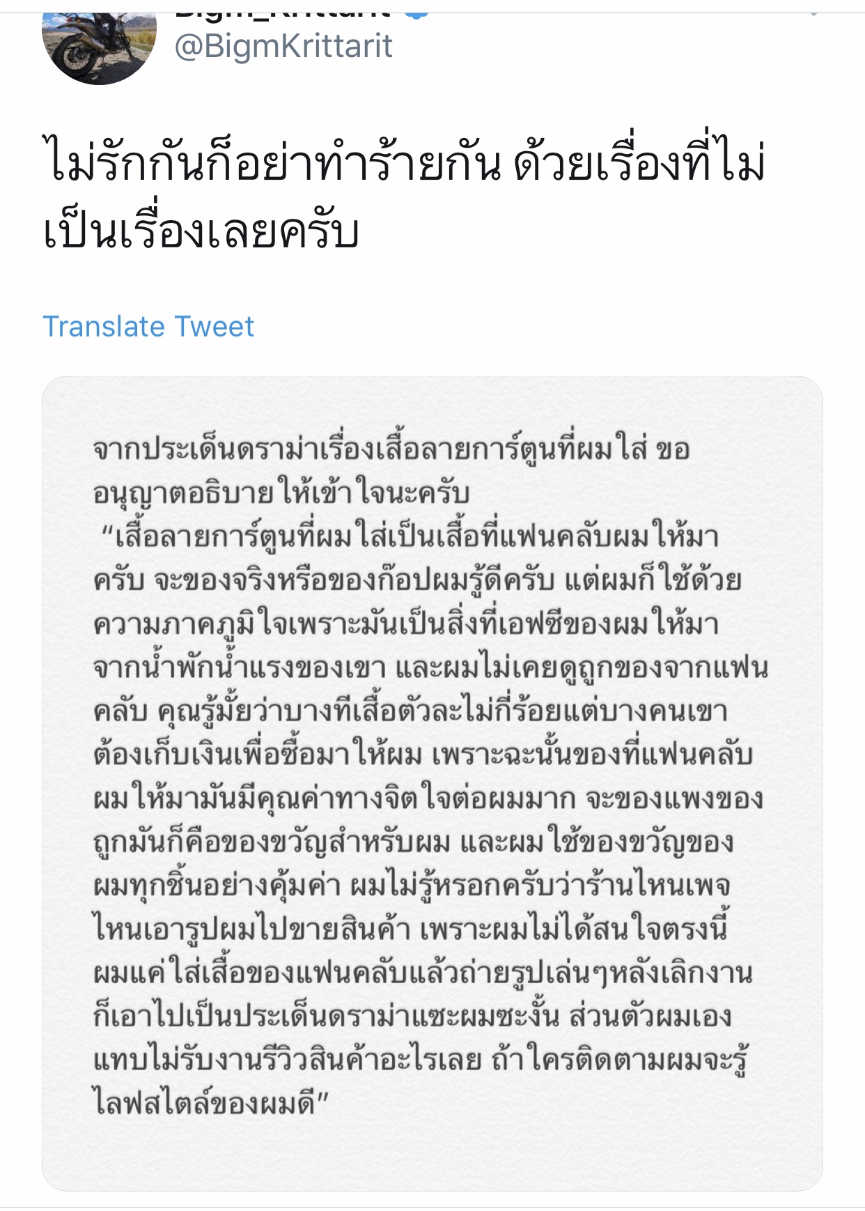“ไม่รักกัน อย่าทำร้ายกัน” ชัดเจน!! บิ๊กเอ็มเคลื่อนไหวแล้วหลังมีประเด็นดราม่าเรื่องเสื้อ