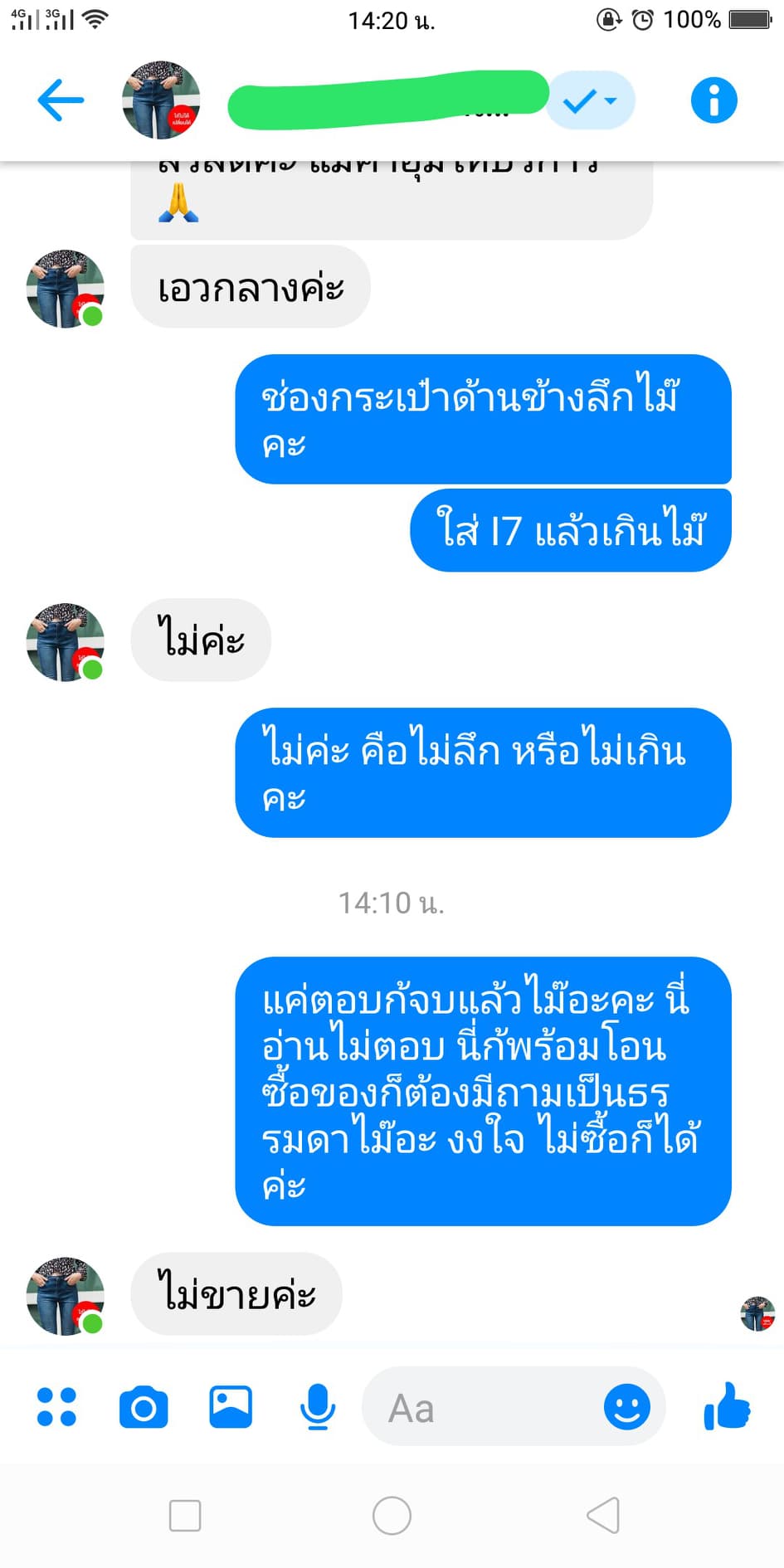 เริ่มเรื่องคือเราอยากซื้อกางเกงยีนส์ แล้วมันมีโฆษณากางเกงยีนส์เด้งหน้าฟีดเราหลายร้านมาก แล้วเราสนใจเพจนึงที่ขายกางเกงยีนส์เกาหลี คนถูกใจแค่ประมาณ 2300 คนมันจัดโปรอยู่ เราจึงทักไปสอบถาม และนี่คือคำตอบที่เราได้ (ตามรูป) เราอยากรู้ว่ามีใครเคยซื้อกางเกงยีนส์เพจนี้ไหม เคยมีปัญหาอะไรเกิดขึ้นหรือป่าว