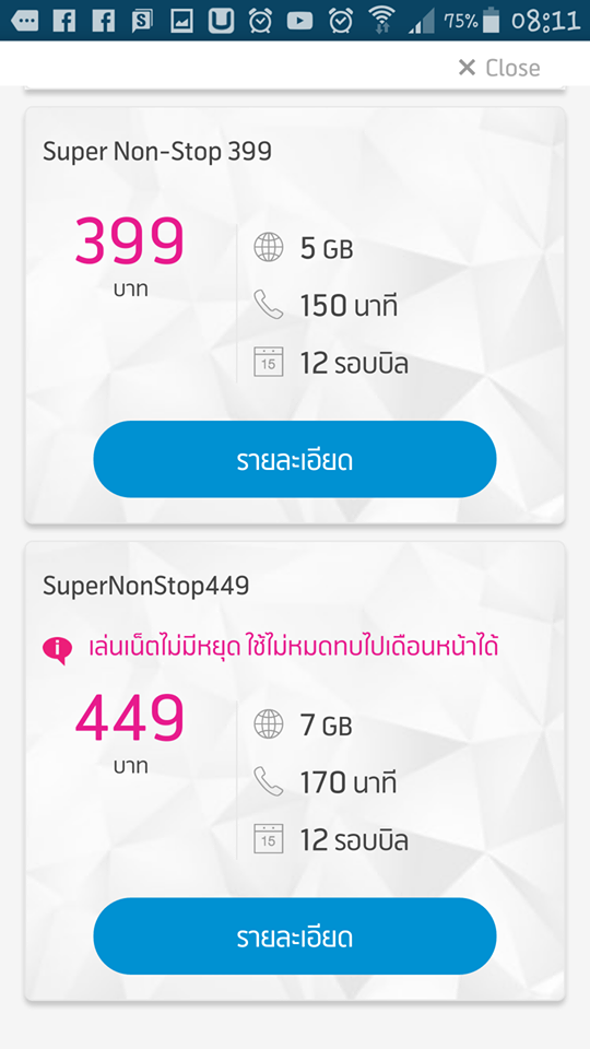 ตอนนี้ผมใช้โปรรายเดือนทรู 179 บาท ไม่รวม VAT พอรวมก็จะ 191 บาท เป็นโปรเน็ต 6 Mbps ไม่อั้นไม่ลดสปีด โทรฟรีทุกเครือข่าย 15 นาที/ครั้ง ถ้าโทรเกินคิดนาทีละ 1.50 บาท