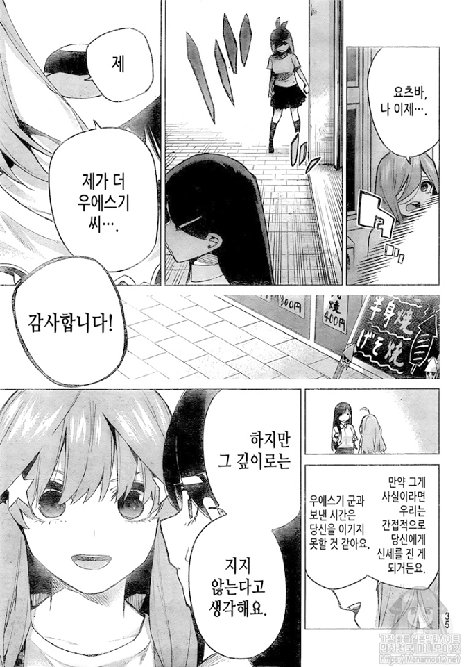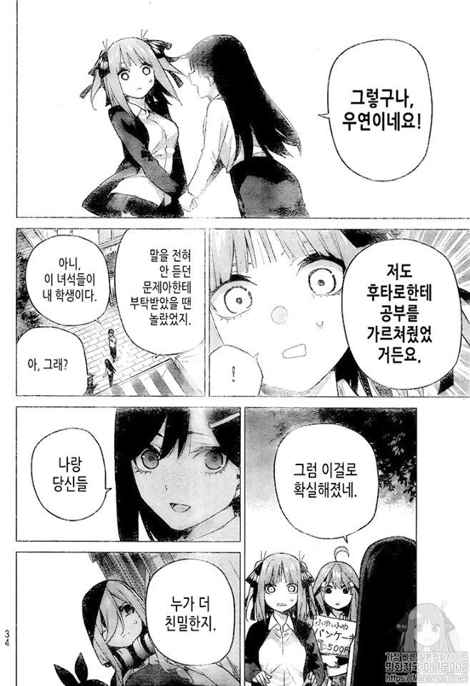 - อิทสึกิตั้งคำถามว่าสุดท้ายแล้วฟุทาโร่จะเลือกใครกันแน่? นิโนะจึงสวนกลับไปว่าอย่าคิดเป็นเรื่องไกลตัว เพราะฟุทาโร่อาจเลือกอิทสึกิก็ได้