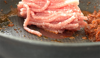 1. ใช้ไฟกลางนะคะ แล้วผัดพริกแกงให้หอม จากนั้นใส่หมูสับลงไป แล้วผัดให้เข้ากัน