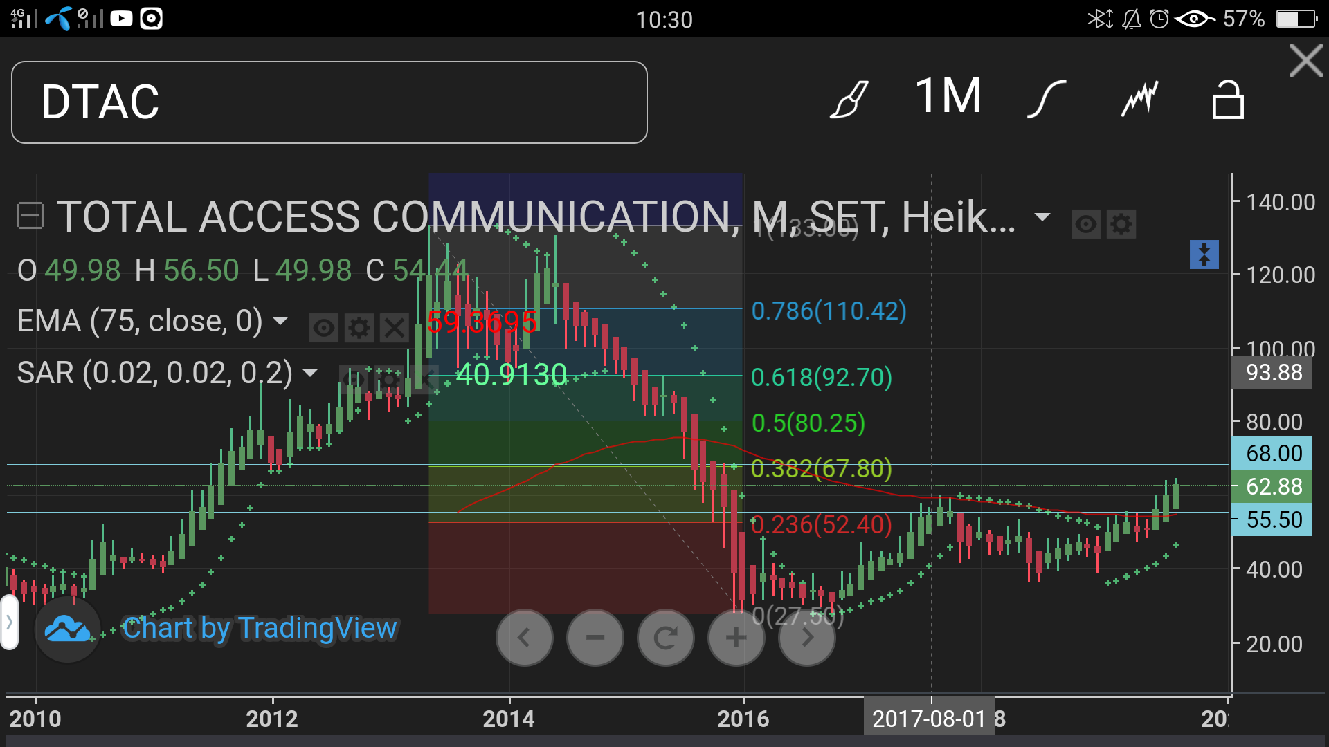 กราฟ TF month เป็นเทรนขาขึ้น(อ้างอิงจากสีเขียวของแท่งราคา HA) โดยมีเป้าหมายแรกในการขึ้นคือ 68 บาท และวาง stop loss ไว้ที่ 55