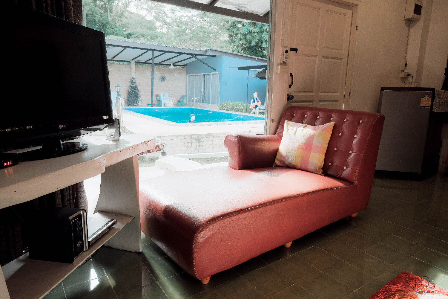 โซฟาแดง นั่งชมวิวสระได้จากในห้องพักเลย