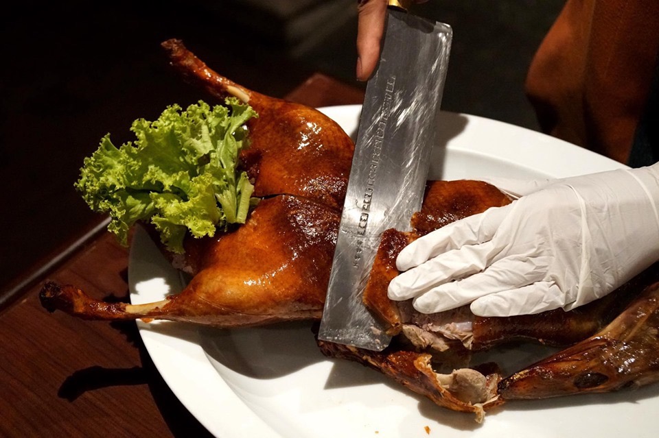 เริ่มจากคอร์สแรก พนักงานจะนำเป็ดที่ย่างตามออเดอร์มาแล่หนังต่อหน้าลูกค้าเลย (14/20)