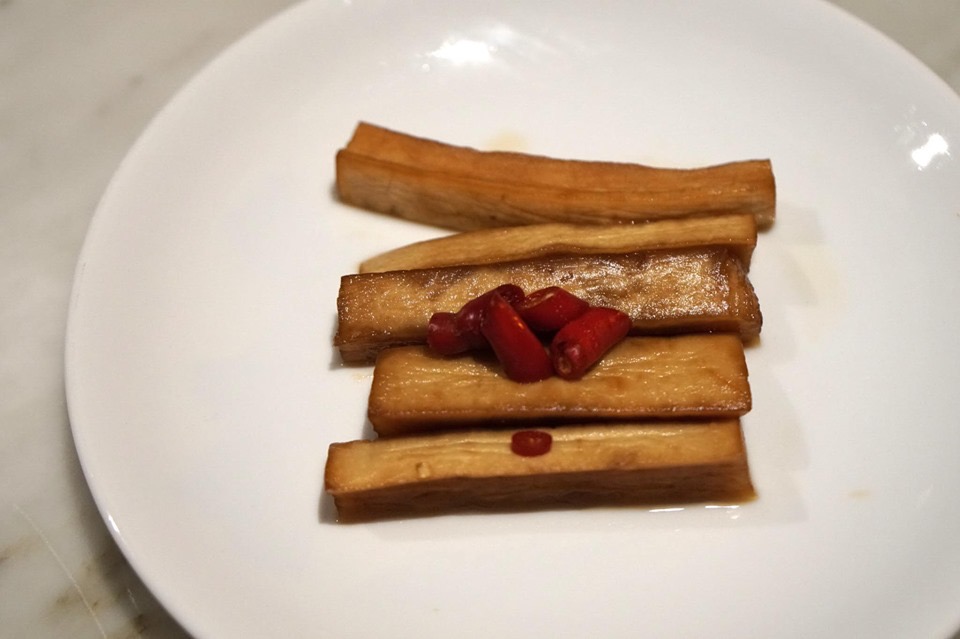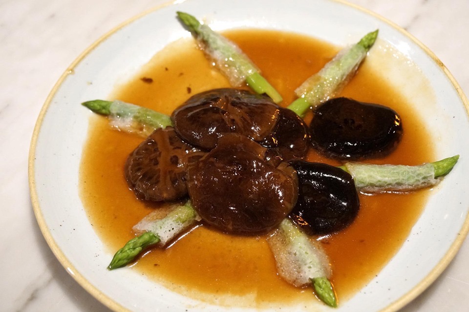 หน่อไม้ฝรั่งหุ้มด้วยเยื่อไผ่ทานแล้วจะได้เนื้อสัมผัสนุ่มละลายในปากของเยื่อไผ่ตัดกันกับความกรอบของหน่อไม้ฝรั่ง ด้านบนเป็นเห็ดหอมสดรสนุ่ม ละมุนในแบบจีน ราดด้วยซอสรสเค็มอ่อนๆ เข้ากันได้ดีมากๆ ตอนแรกที่อ่านเมนูผัก คิดว่าจะสั่งมาตัดรสอาหารคาวจานอื่นๆ ไม่คิดว่าจะอร่อย โดยรวมถือว่าโอเคสำหรับคนที่ชอบทานเห็ดหอมและเยื่อไผ่ (11/20)