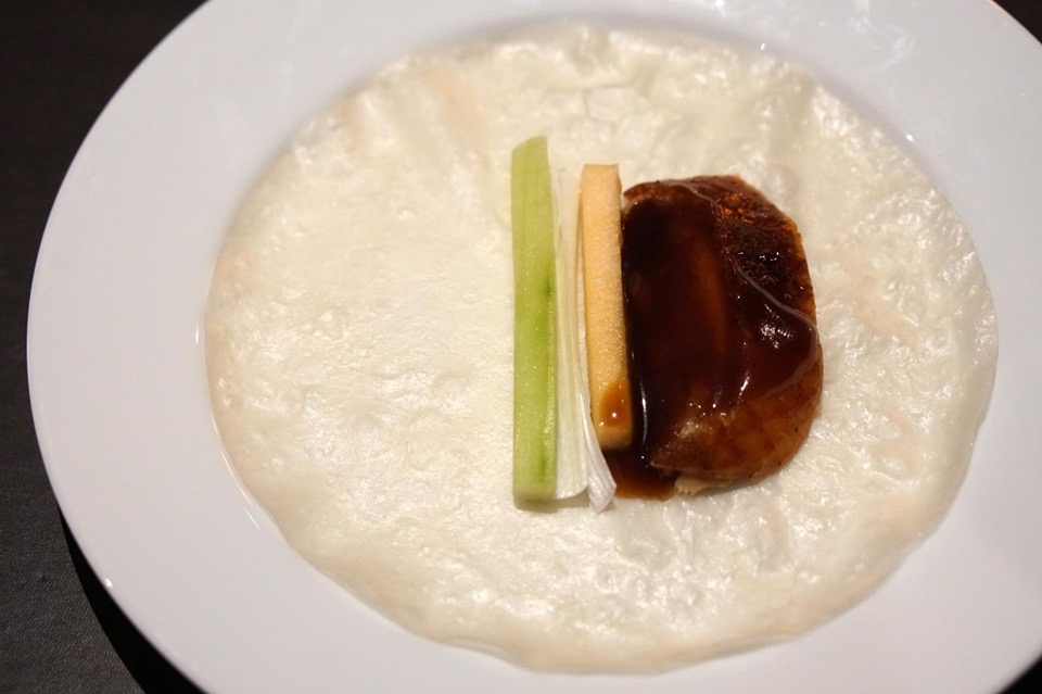 1ST COURSE: CRISPY SKIN SERVED WITH CHINESE PANCAKES AND CONDIMENTS