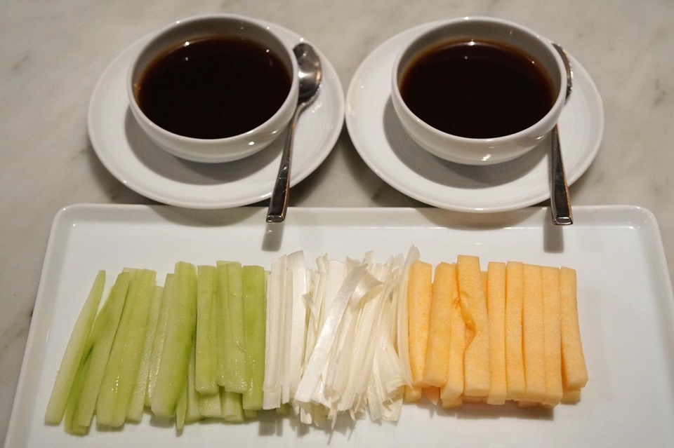 แป้งแพนเค้กบางราวกับกระดาษ ขนาดเท่าๆกัน แผ่นเรียบพอใช้ได้ มีเนื้อสัมผัสนุ่มมาก ไม่กลบรสสัมผัสที่ดีของหนังเป็ด สุดยอดจริงๆ (14/20)