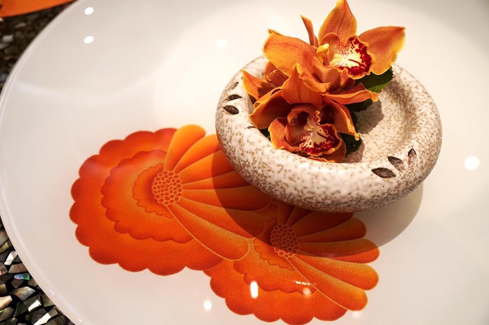 🌺 บนโต๊ะอาหารตกแต่งด้วยลายและดอกไม้สีส้มเข้ากันกับตัวร้าน เก้าอี้ที่ร้านนั่งลำบากไปหน่อย การบริการของพนักงานอยู่ในเกณฑ์พอใช้ ดีกว่าร้านอาหารจีนทั่วไป แต่ยังไม่เชี่ยวชาญเท่าร้านอาหารยุโรป