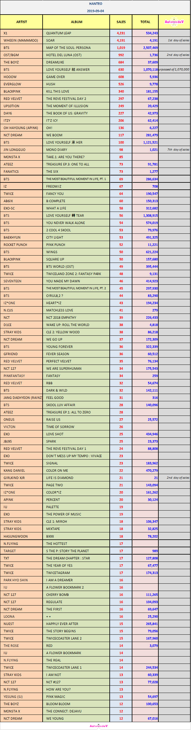 ยอดซื้ออัลบั้มจากชาร์ต HANTEO 4 กันยายน 2562