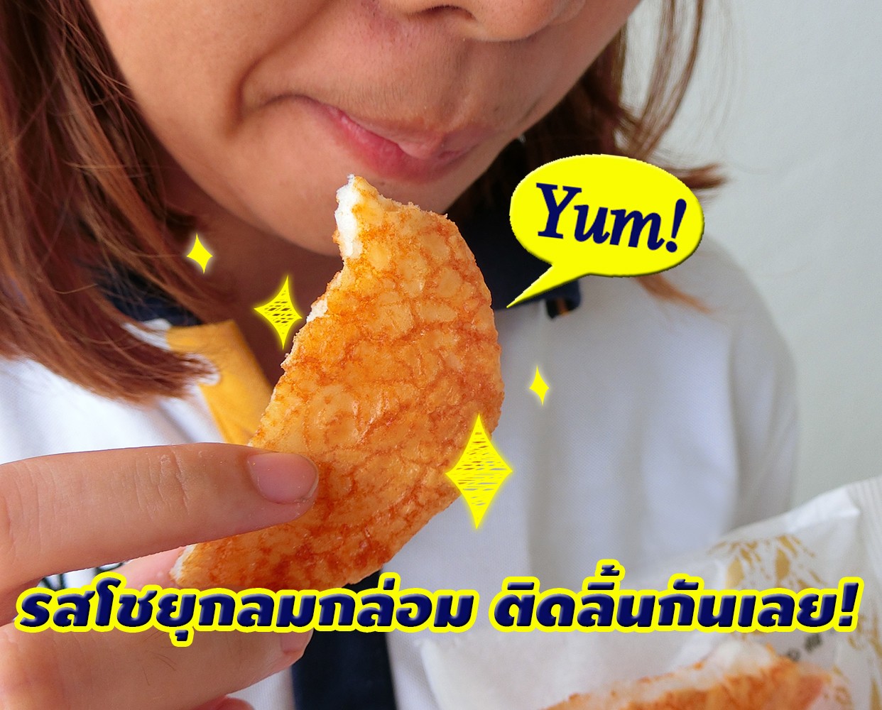 กัดคำแรกต้องขอบอกเลยว่า กรอบมว๊าาาาากกกกกกก!!!!!!!! ความกรอบเต็ม 10/10 รสสัมผัสถึงรสซอสโชยุเต็มปากเต็มคำ กลิ่นที่โชยเมื่อกี้ตอนดม ผสมกับรสชาติที่ได้ชิมตอนนี้ บอกได้เลยว่าฟิน กลมกล่อมกำลังดีเลย หากได้กินตอนดูหนัง หรือเชียร์บอลกับเพื่อนๆ นี่เหมาะมาก
