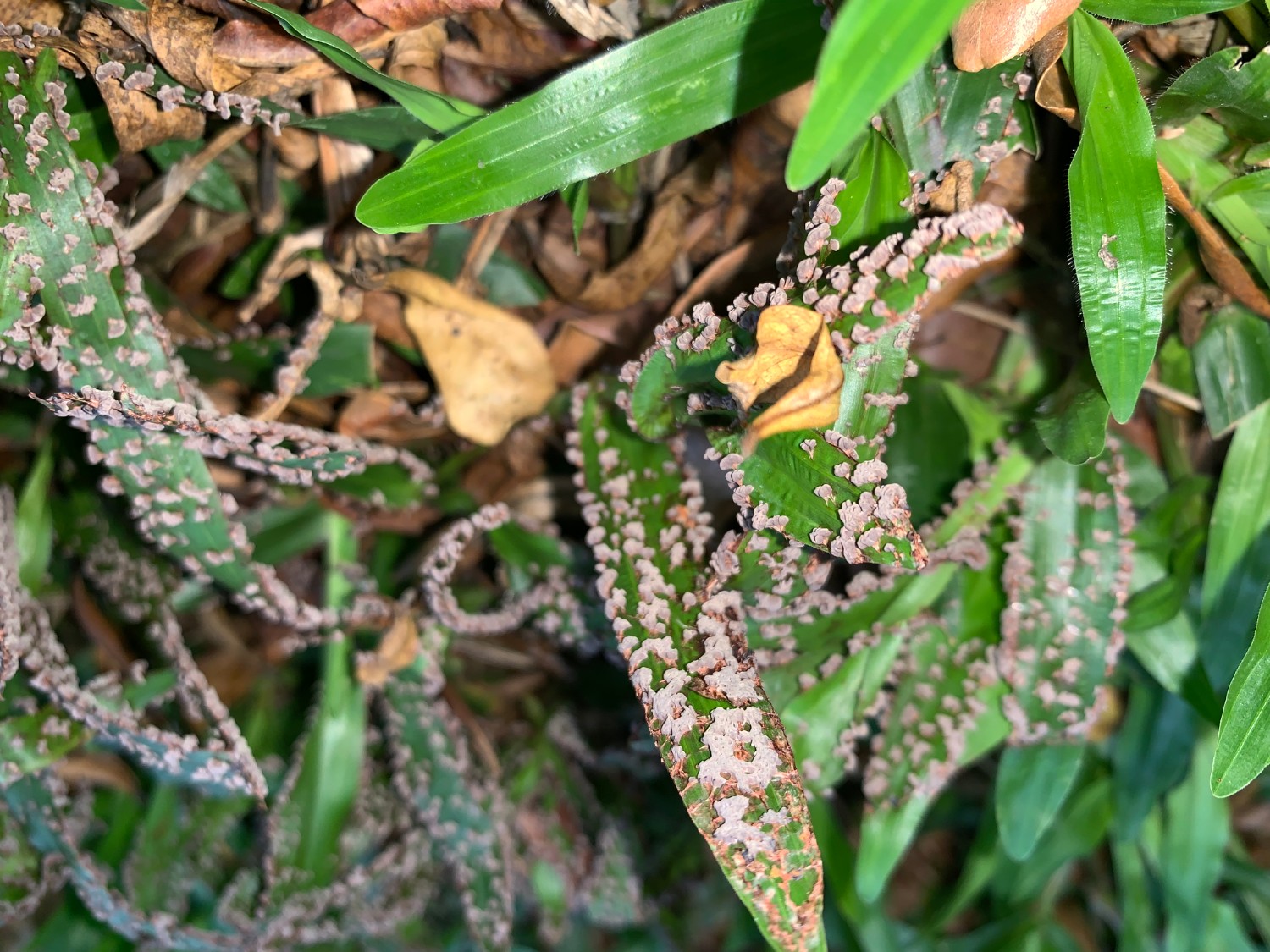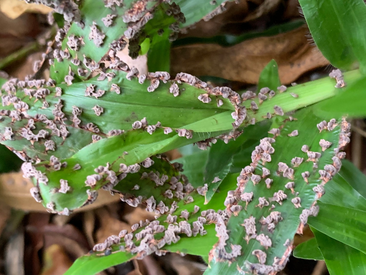 ใบหญ้ามีดินเกาะ พอดูใกล้ๆเหมือนเป็นเกล็ด