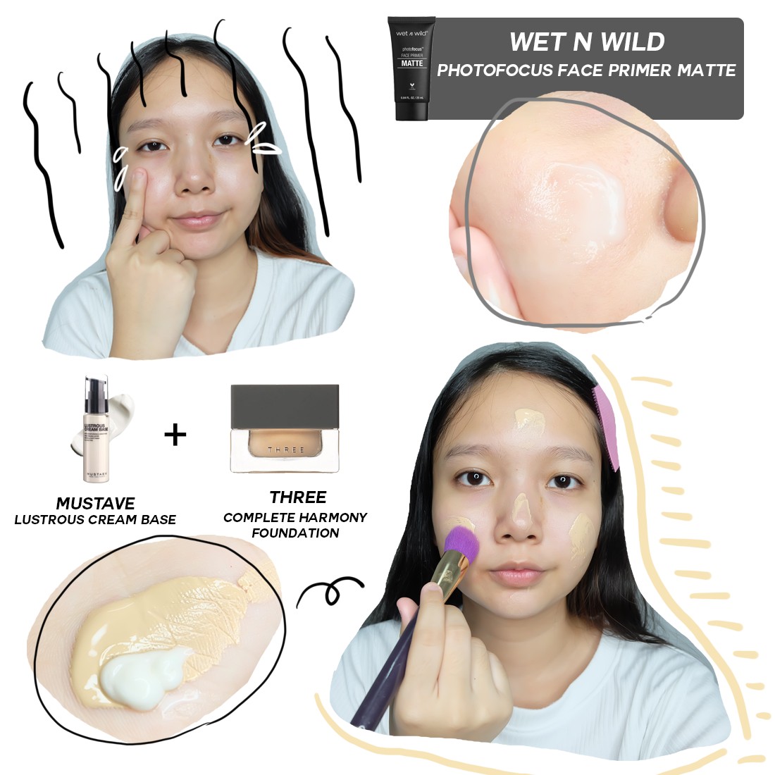งานผิวและโครงหน้า : WET N WILD Photofocus Face Primer Matte , MUSTAVE Lustrous Cream Base