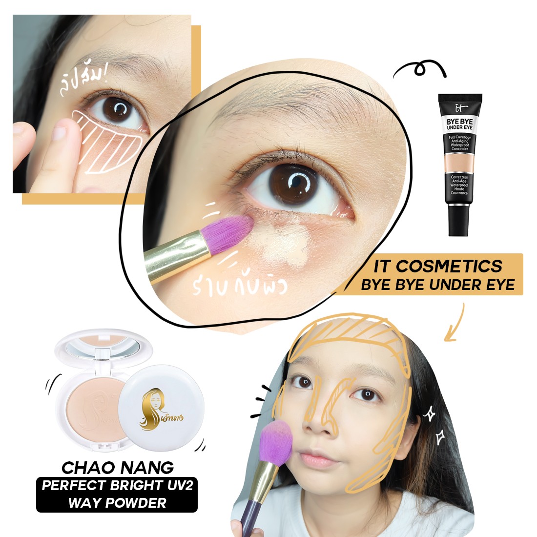 แล้วค่อยลงคอนซีลเลอร์วันนี้เราใช้ IT Bye Bye สี Medium เป็นสีที่ตรงกับผิวทาด้วยแปรงโดยจับให้ขนแปรงราบแนบ