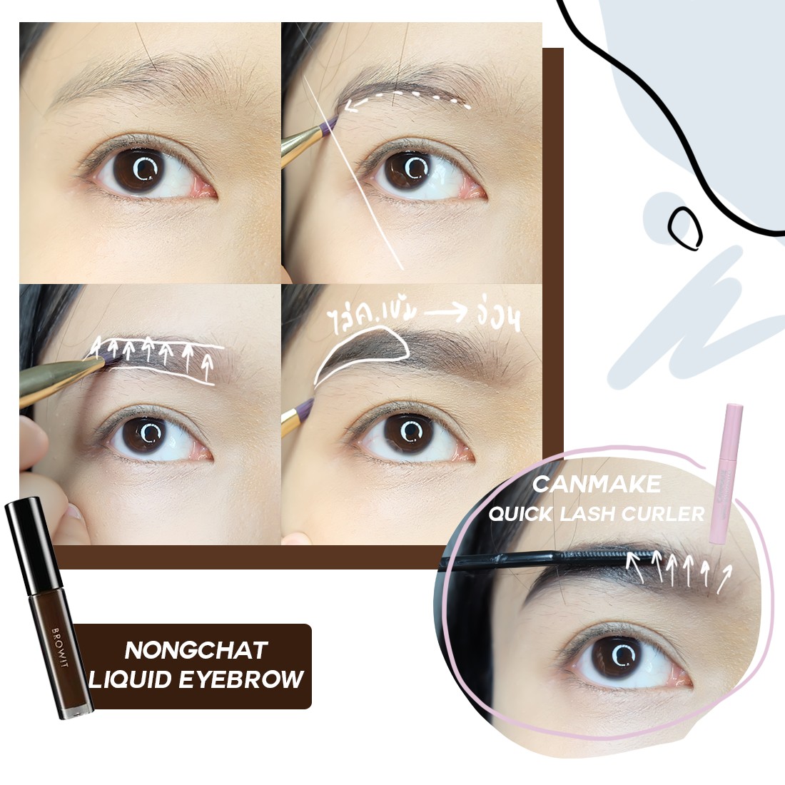 ความเข้มที่หางคิ้วไล่จากเข้มไปยังหัวคิ้วอ่อน แล้วใช้มาสคาร่าของ CANMAKE สีใส ปัดจากล่างขึ้นบนให้ขนคิ้วตั้ง