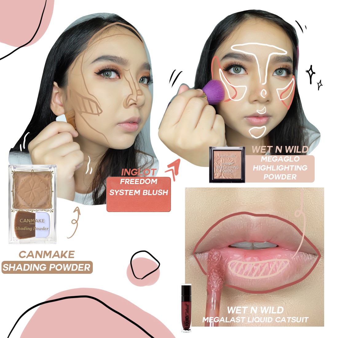 สร้างโครงหน้าให้ชัดด้วย CANMAKE ปัดย้ำๆ ซ้ำๆ ตรงที่เราทาด้วย IT Bye Bye สี Rich ปัดบลัชออนสีออกพีชๆ ของ INGLOT