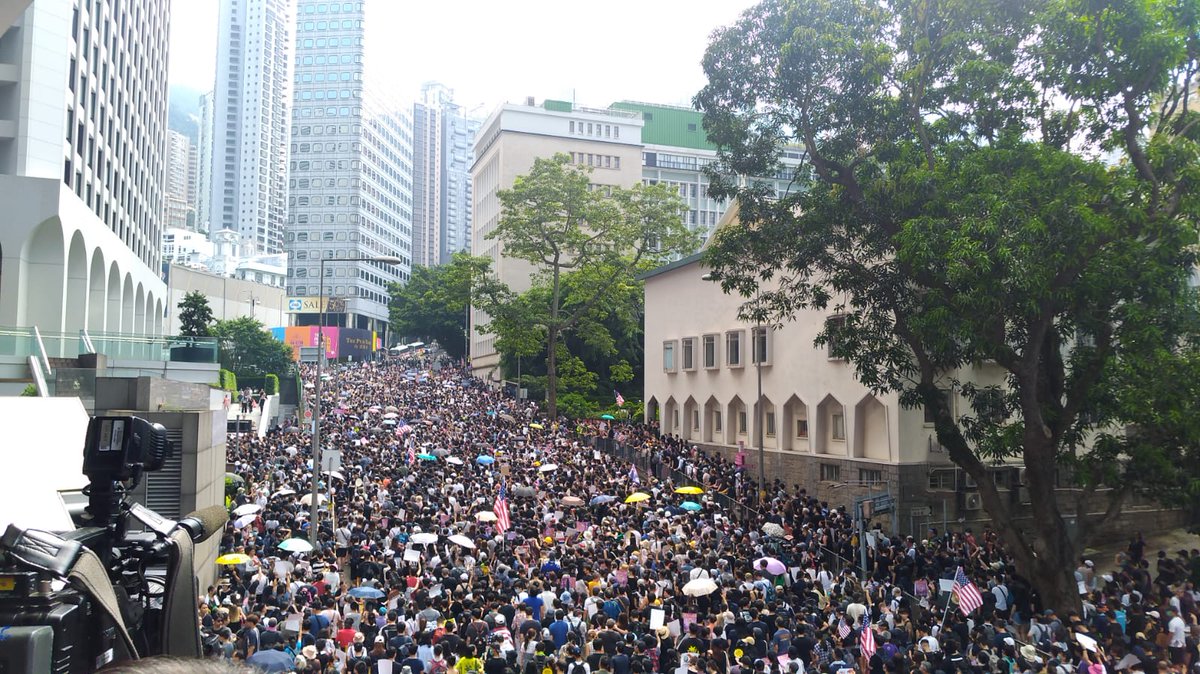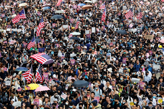 ล่าสุดผู้ประท้วงหลายพันคนโบกธงชาติอเมริกันพร้อมกับร้องเพลง สตาร์-สแปงเกิลด์ แบนเนอร์(Star-Spangled Banner)ไปด้วย พร้อมกับร้องขอให้ประธานาธิบดีสหรัฐฯ โดนัลด์ ทรัมป์ ช่วยปลดปล่อยเกาะฮ่องกงให้เป็นอิสระ