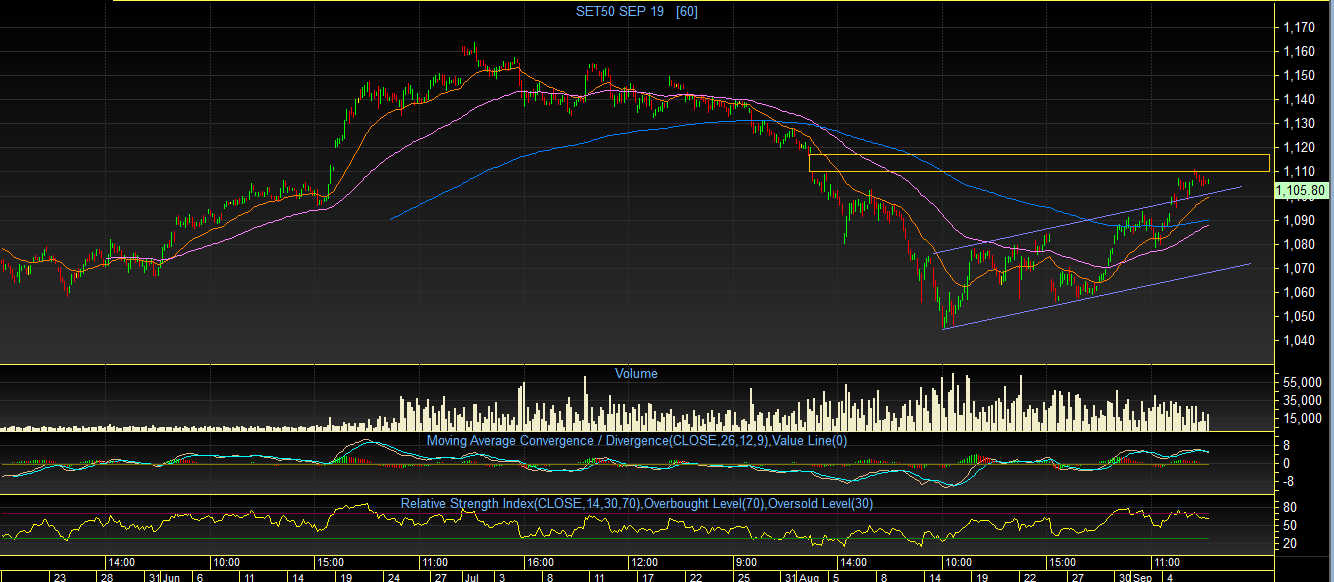 แต่อย่างไรก็ตาม เมื่อดัชนีขึ้นมาทดสอบระดับ 1110 จุด เริ่มเห็นการอ่อนตัวลงมา อันเนื่องมาจาก ปริมาณการซื้อขายที่เบาบาง จึงปิดแท่งเทียน