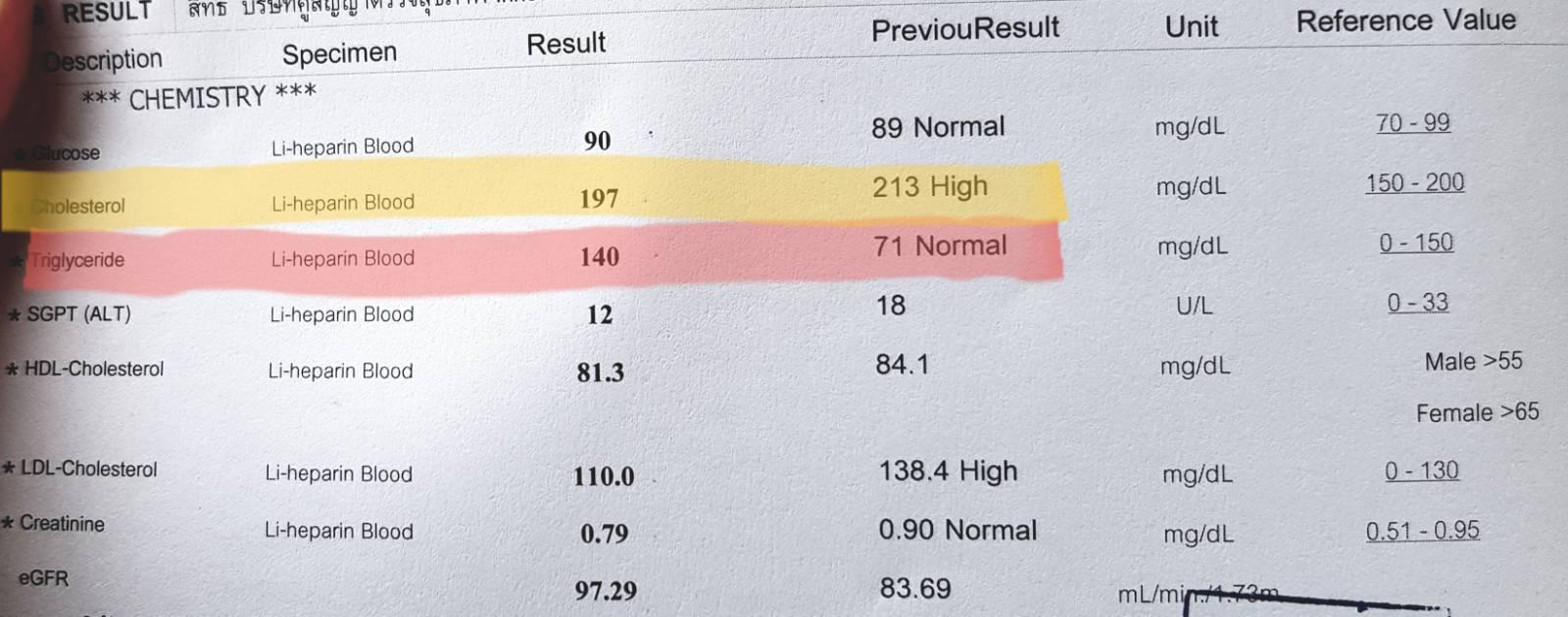 ถึงเทียบกับเกณฑ์แล้วถือว่ายังอยู่ในระดับปกติ แต่ว่าพอเห็นค่าเพิ่มขึ้นเท่าตัว เลยงงๆว่า คอเลสเตอรอลลดลง แต่ไตรกลีเซอไรด์เพิ่มได้ขนาดนี้เลยเหรอ