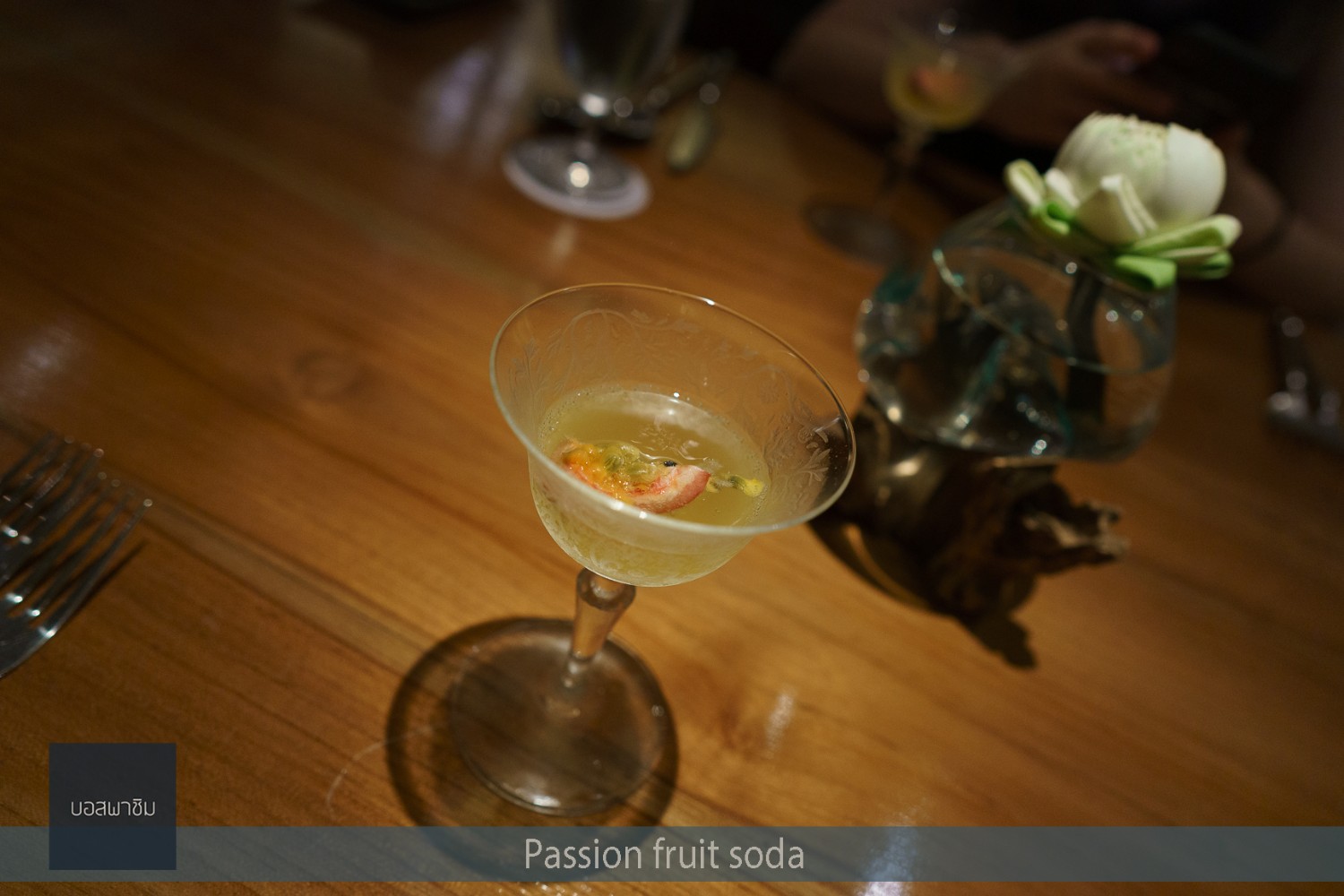 เครื่องดื่มcomplimentary แก้วนี้เป็นเครื่องดื่มล้างปากของทางร้านครับ ประกอบด้วยเสาวรส น้ำตาลตโนด และโซดา จะได้ทั้งสองเซท