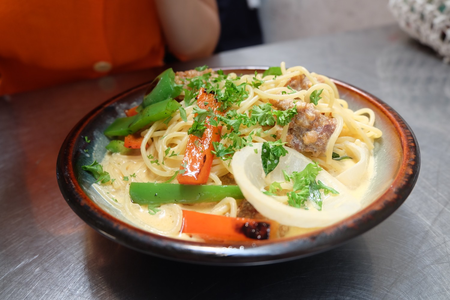 จานนี้เป็นเมนูสปาเก็ตตี้ รสชาติแปลๆ ไม่ค่อยถูกปาก เหมือนจะเป็นครีมแต่มีกลิ่นเฉพาะตัว มาพร้อมไก่ชุปแป้งทอดและผักทั้งหลายในจาน
