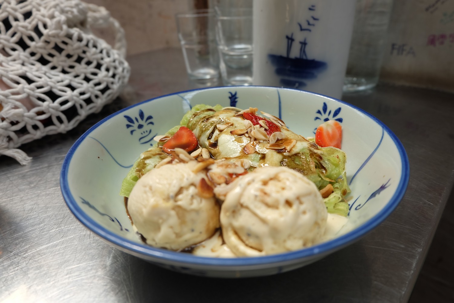 จานนี้เป็นของหวาน เป็นแป้งคล้ายๆทองม้วนสดบ้านเรา ปนด้วยชีส โรบด้วยแอลมอลบางๆพร้อมสตอเบอร์รี่ เสริฟพร้อมไอติมวนิลา