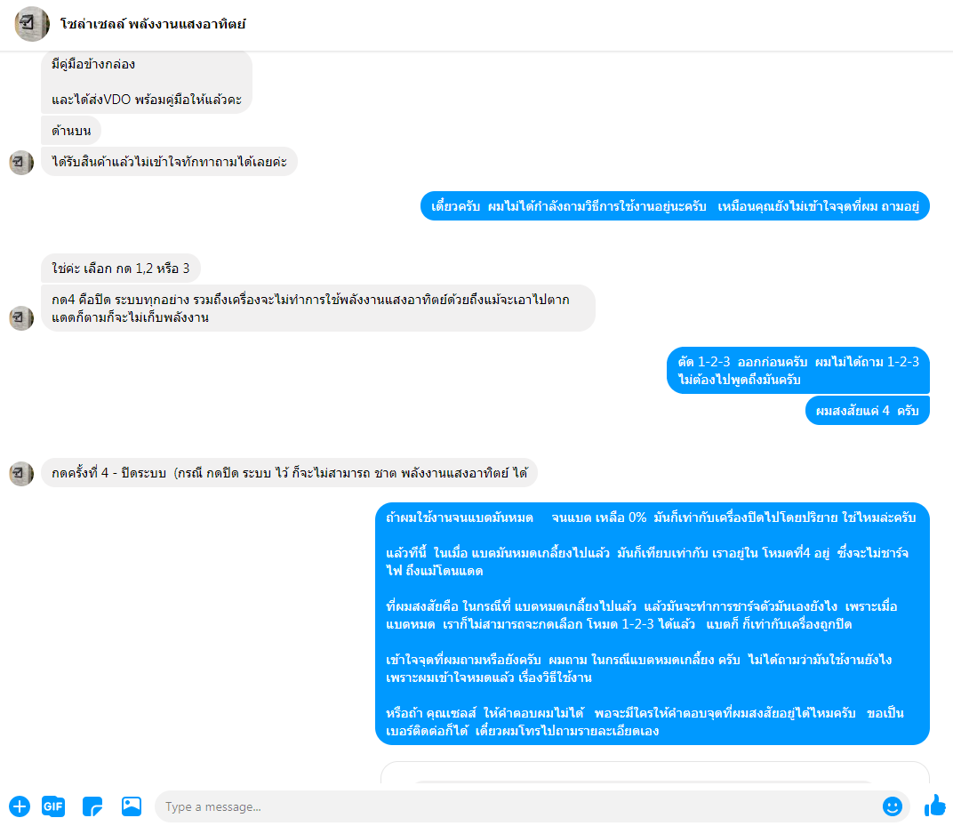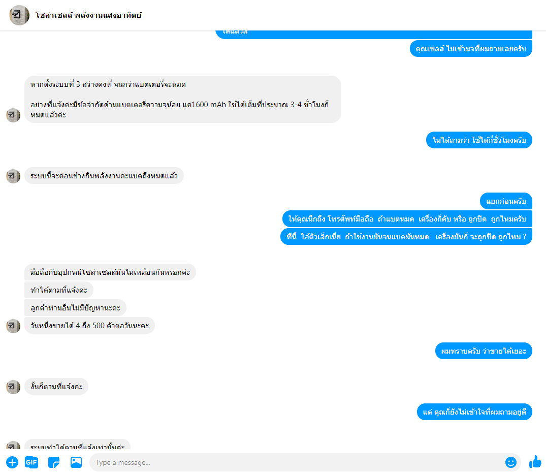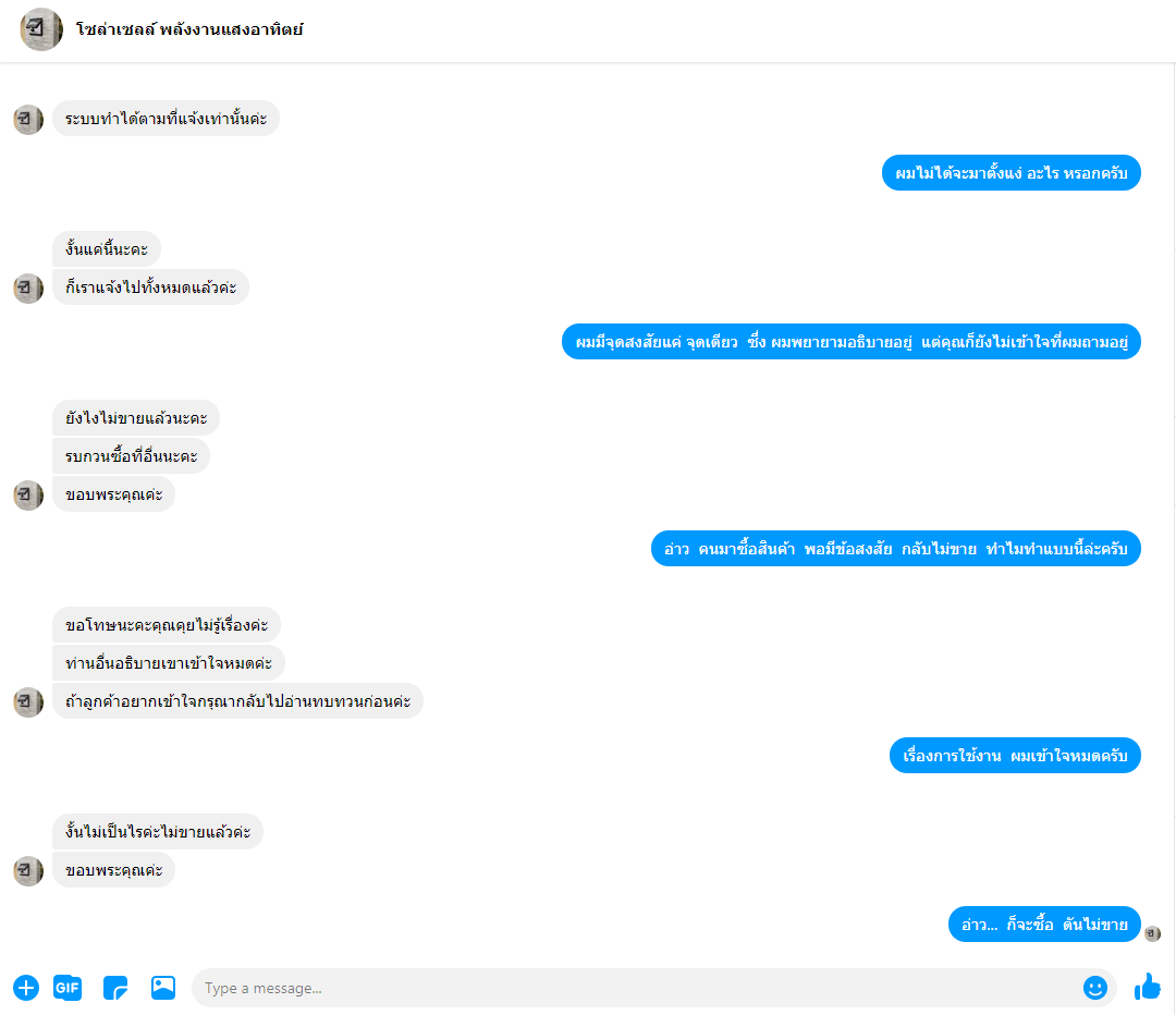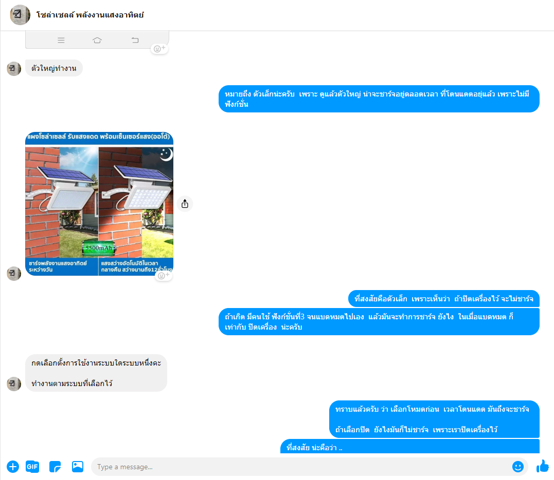 ผมจะซื้อดวงไฟโซลาร์เซลส์ครับ เลยติดต่อร้านนึงในFacebook แต่มีคำถาม อยู่จุดนึงที่ไม่เข้าใจ ตกลงผมผิดหรือไม่ครับ?
