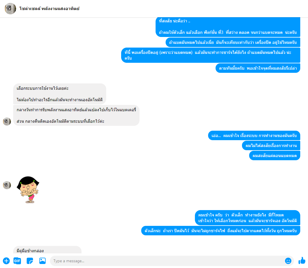 คือผม ไม่ได้สงสัยเรื่องวิธีการใช้งาน ผมเข้าใจหมด แค่สงสัย เรื่องกรณีที่ใช้จนแบตหมดเกลี้ยง แล้วไอ้ตัวเล็กที่เขาขาย มันมี 3ฟังก์ชั่น ถ้าเราปิดเครื่องมันอยู่ ตากแดดแค่ไหนมันก็ไม่ชาร์จ ก็เลยสงสัย ถ้าแบตหมด มันก็เท่ากับเครื่องปิด แล้วมันจะเก็บประจุยังไง คือ นางก็ไม่ตอบ หรือตอบไม่ได้ ก็พูดแต่ วิธีการใช้งาน คือผมไม่เข้าใจ หรือนางไม่เข้าใจ พยายามอธิบายแล้วหลายที