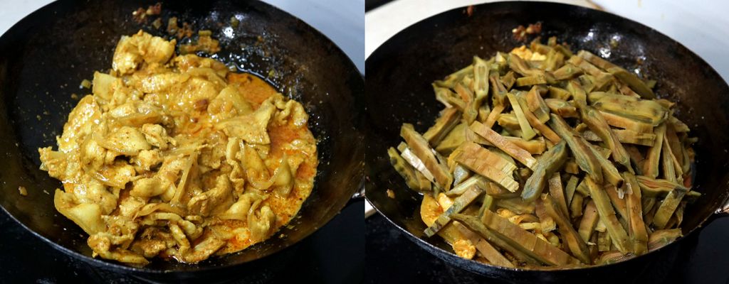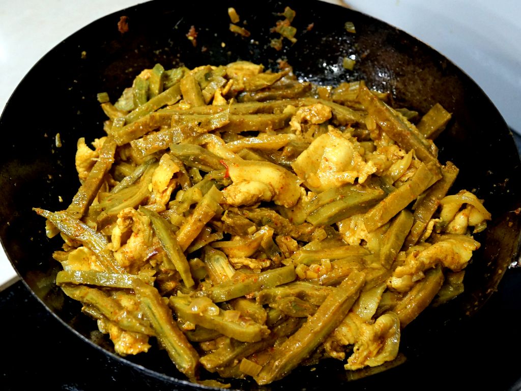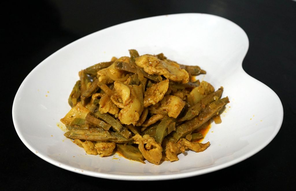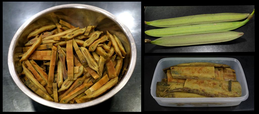 ซื้อลิ้นฟ้ามาจากตลาด ฝักละ 10 บาท นำมาย่างไฟ ขูดทำความสะอาด หั่นเป็นชิ้นเล็กๆ นำไปผัดกับพริกแกงใส่หมูสามชั้น