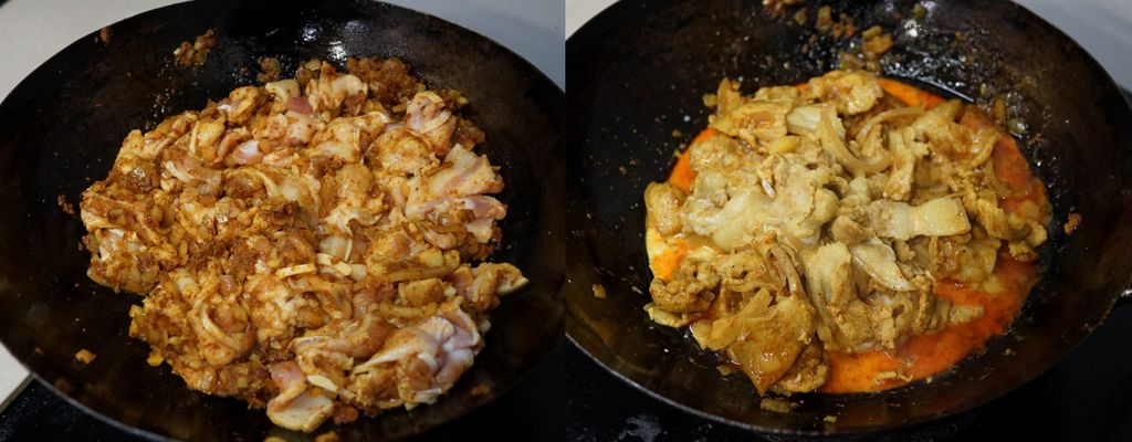 เอาหอมใหญ่ซอยไปผัดให้สุก ใส่พริกแกงเผ็ดใต้ลงไปผัดให้หอม ใส่หมูสามชั้น