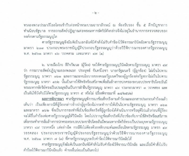 นอกจากนี้ศาลรัฐธรรมนูญยังพิจารณาคำร้องของนายเรืองไกร ลีกิจวัฒนะ ขอให้วินิจฉัยว่าตามรัฐธรรมนูญ มาตรา 49 ว่า การถวายสัตย์ปฏิญาณของ พล.อ.ประยุทธ์ ไม่เป็นไปตามรัฐธรรมนูญมาตรา 161 และการแถลงนโยบายของคณะรัฐมนตรีต่อสภาไม่เป็นไปตามรัฐธรรมนูญ มาตรา 162 นั้น ศาลรัฐธรรมนูญพิจารณาข้อเท็จจริงตามคำร้องและเอกสารประกอบแล้ว มีมติเอกฉันท์ไม่รับคำร้องเช่นกัน โดยเห็นว่า เป็นเพียงกรณีที่นายเรืองไกรอ้างว่า พล.อ.ประยุทธ์ และคณะรัฐมนตรีได้ดำเนินการหรือยุติไปแล้วก่อนที่จะยื่นคำร้องต่อศาลรัฐธรรมนูญวินิจฉัย ไม่ปรากฎข้อเท็จจริงว่ามีการเกี่ยวข้องกับการใช้สิทธิหรือเสรีภาพเพื่อล้มล้างการปกครอง ตามรัฐธรรมนูญ มาตรา 49 แต่อย่างใด กรณีจึงไม่ต้องด้วยหลักเกณฑ์และเงื่อนไขตามรัฐธรรมนูญ มาตรา 49