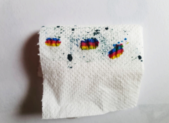 เมื่อล้างหัวพิมพ์ แล้วลองใช้ทิชชู่ซับที่หัวพิมพ์ก็ออกทุกสีนะคะ