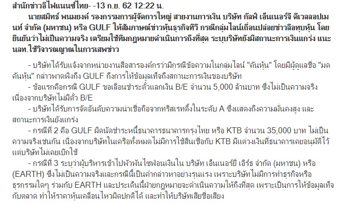 Gulf เตรียมดำเนินคดีคนปล่อยข่าวลือทุบหุ้น