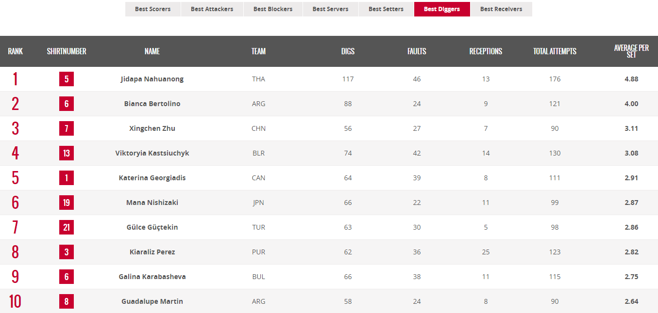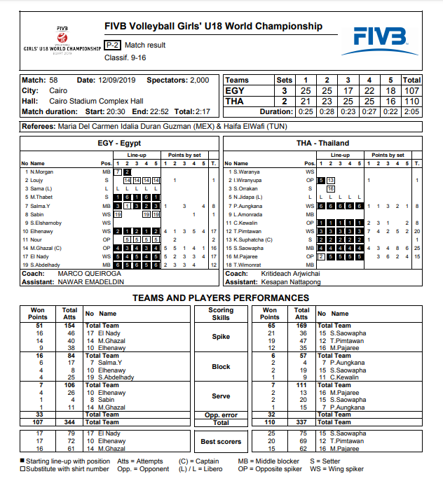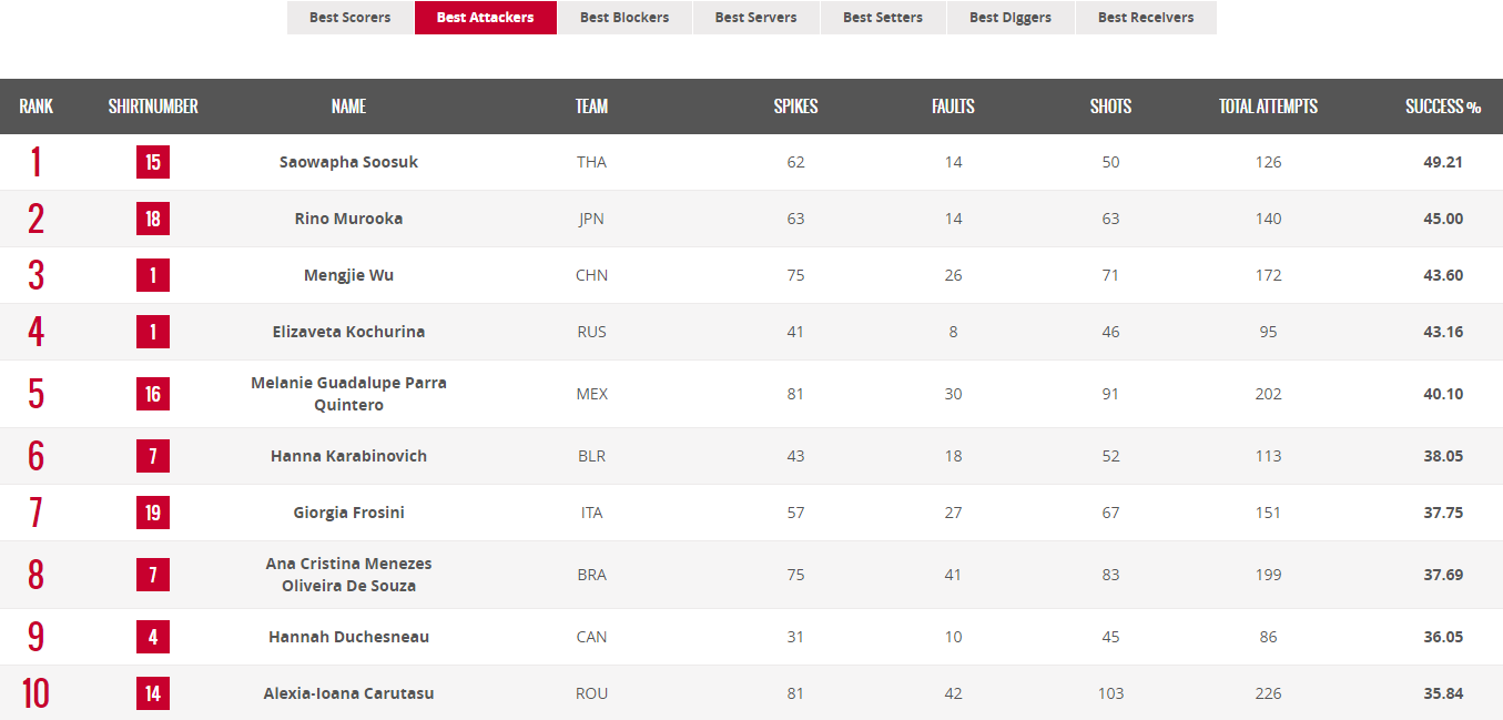 Official website ลงสถิติค่อนข้างช้า มีเฉพาะ 2 นัดแรกครับ เลยเอามาฝาก นัดแรก THA-KAZ อนุตร Top score 14 คะแนน (spike rate 55%) ภูสิทธิ์ 11 คะแนน (Spike rate 47%) นัดที่สอง THA-TPE กันตพัฒน์ Top scor