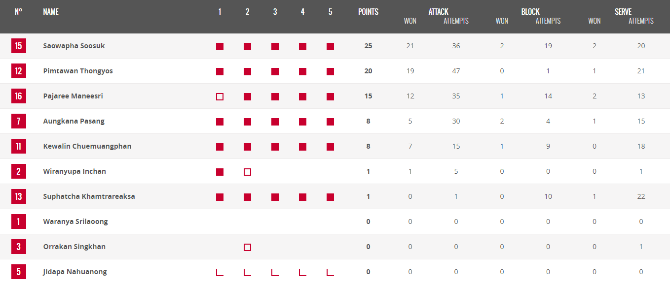 น้องบีม 20 แต้ม (Spike rate 53.3%) น้องบุ๋มบิ๋ม 17 แต้ม (Spike rate 52.6%, 5 Aces) ที่มา: SMMsport