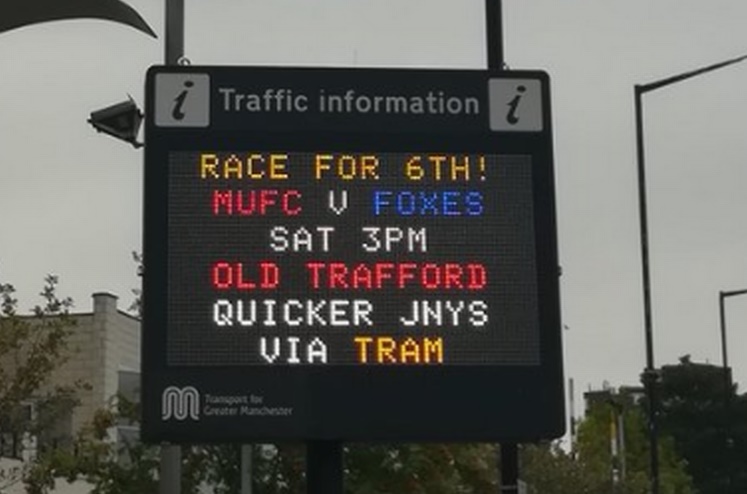 ตำรวจจราจรเมืองแมนเชสเตอร์ ขึ้นข้อความบนป้ายจราจรล้อเลียนทีม "ผีแดง" แมนเชสเตอร์ ยูไนเต็ด ว่าจะเปิดรังชิงอันดับ 6 กับ เลสเตอร์ ซิตี้