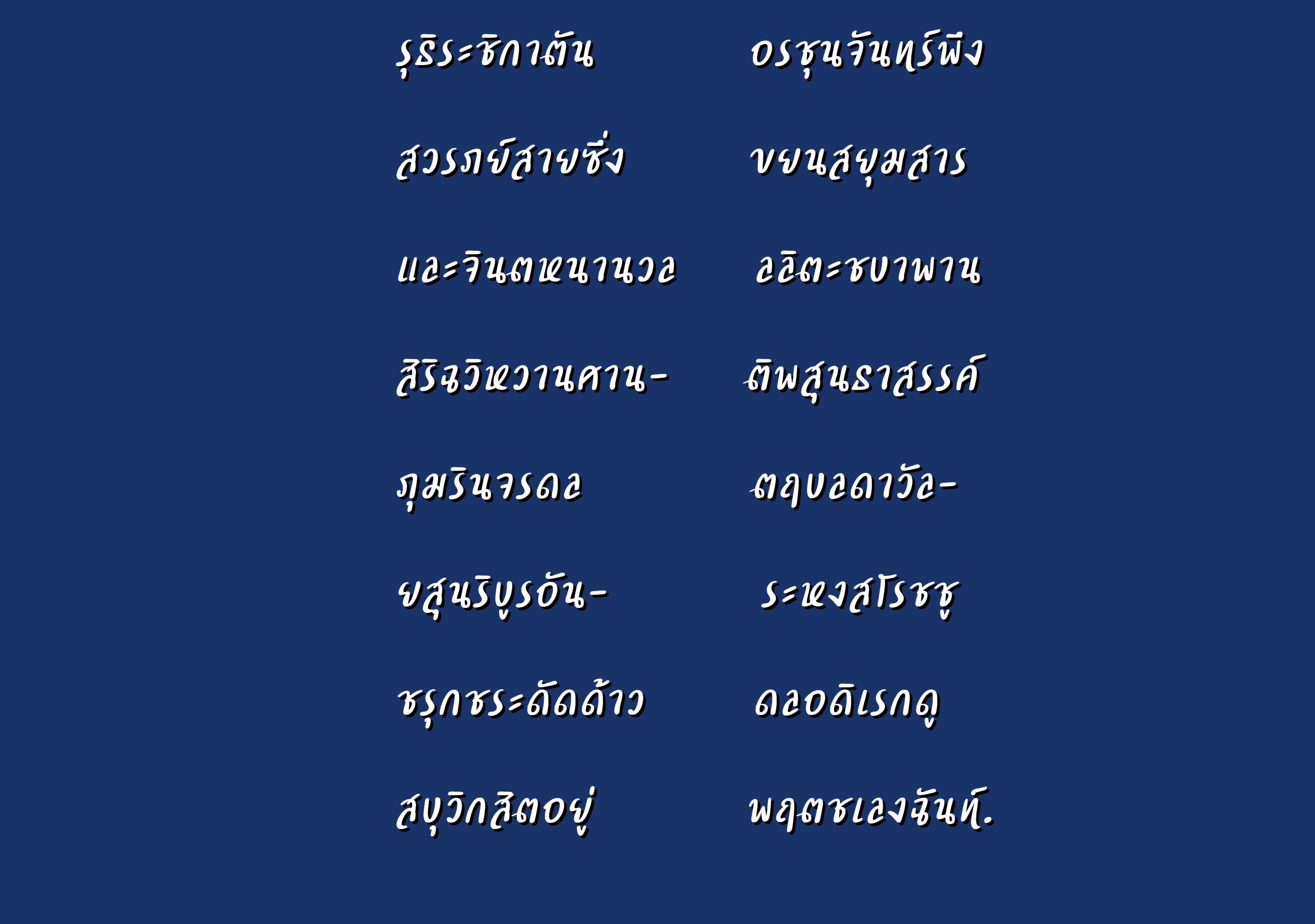 ชื่นฉมชมชื่นในคืนหนาวอลอวลคราวขาวดื่นระรื่นโฉมดุจดาวพริบระยิบพร้อยลอยพโยม ชวนชโลมจินตนาพาลิ่วลม ล่องวิมานผ่านภพจบสวรรค์ยินคนธรรพ์บรรเลงเพลงรักสมสู่ฉิมพลีพิศวาสบาดอารมณ์ไอรักห่มห้อมสรวงล่วงนิทรา&n