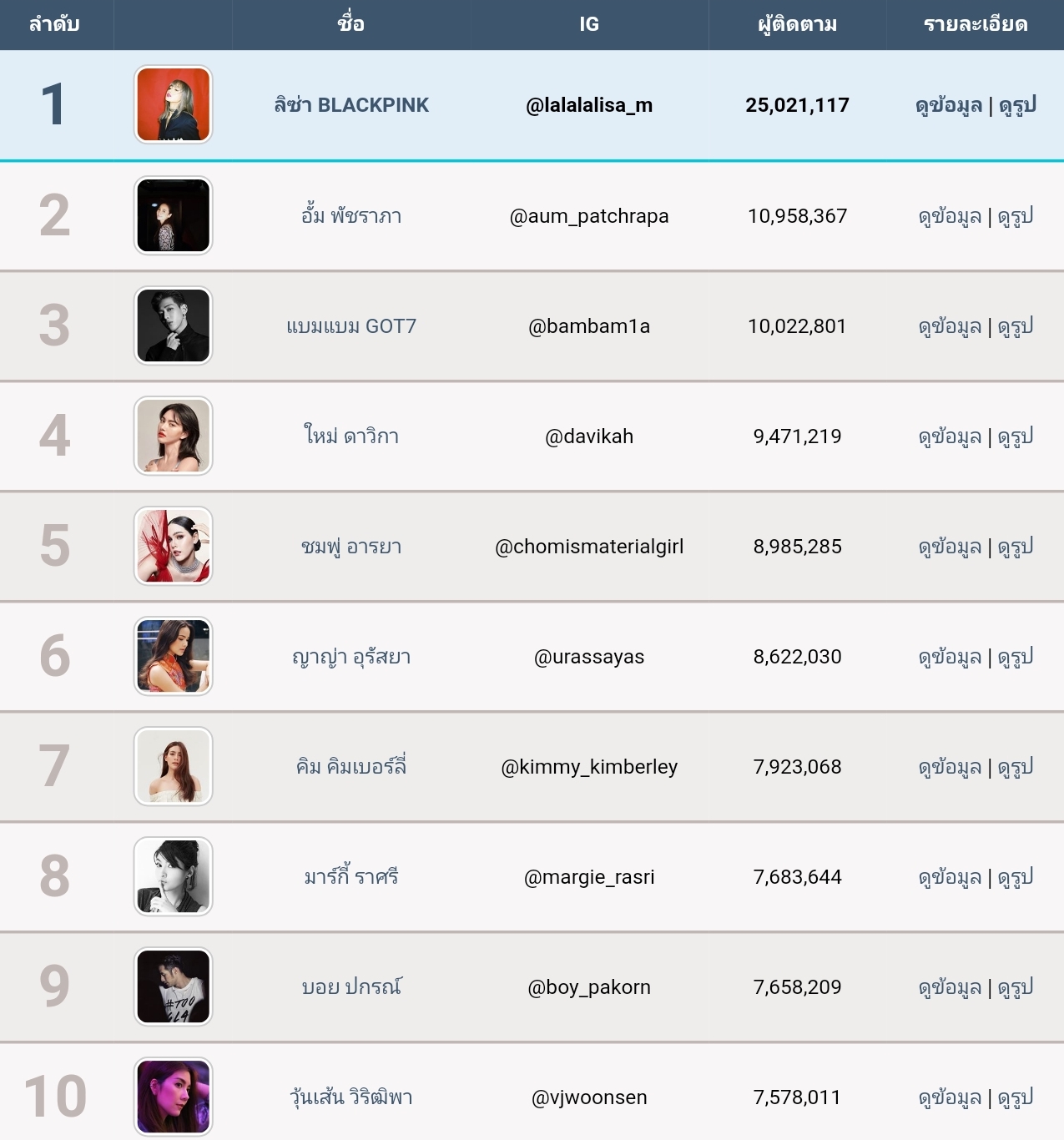 UPDATE 10 "คนไทย" ยอดผู้ติดตามสูงสุด "ลิซ่า BLACKPINK" ยืนหนึ่งใน IG