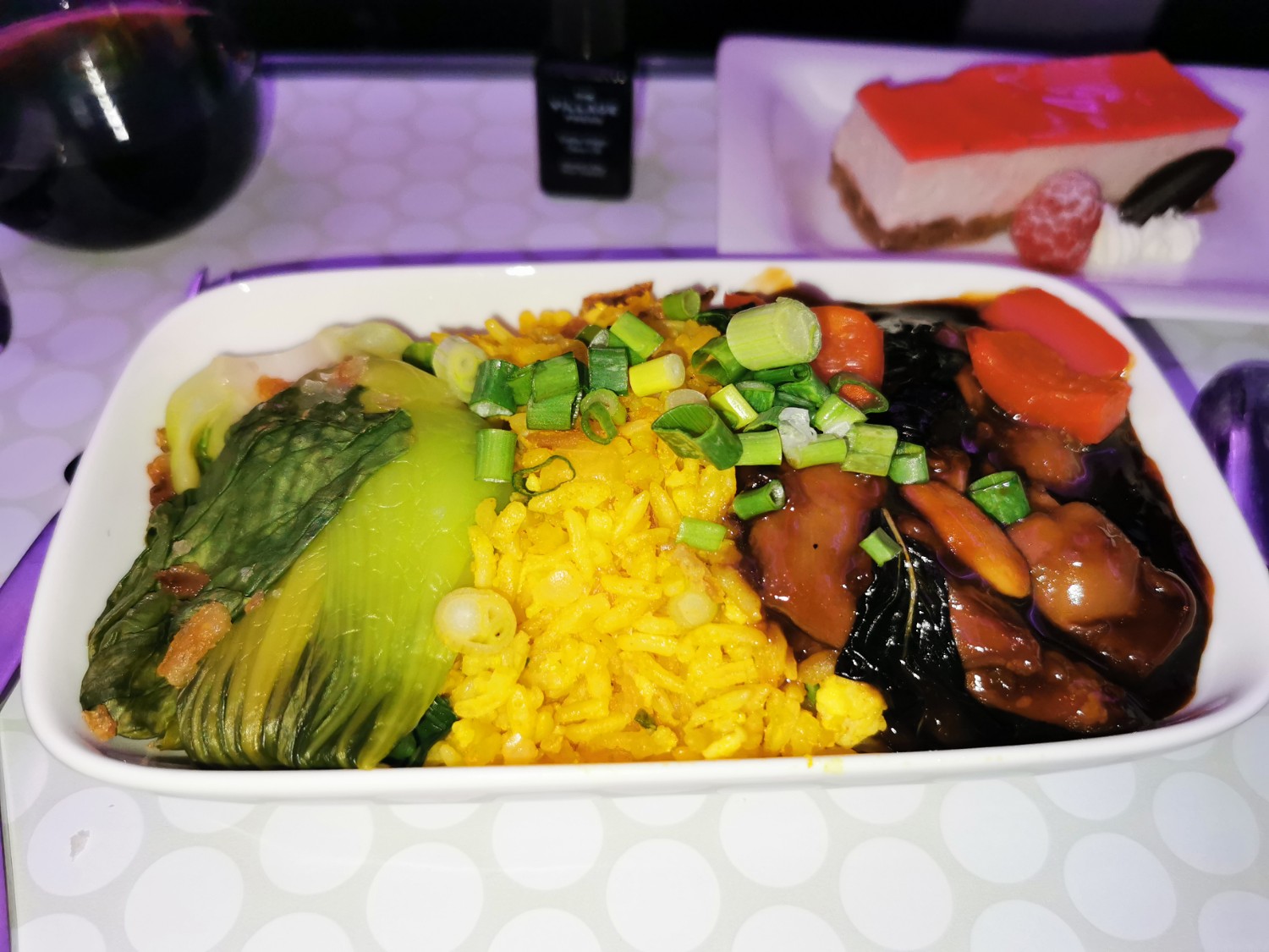 จานหลักของเพื่อนเป็นไก่อบซอสแบบจีนและข้าวผัดใส่เครื่องเทศ