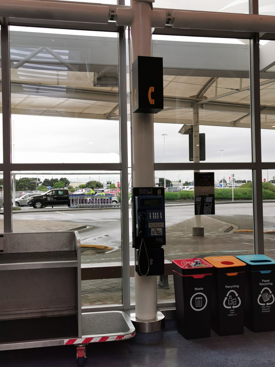 พอเราออกมา ก็เดินไปตามนัดคือ "After entering the arrivals hall, call us on our free phone number 0508 WILDERNESS (0508 945 337) At the Auckland international terminal, exit via door 3 and wait on the traffic island across the road. เรายังไม่ได้ซื้อซิมที่โน้น ก็เลยพยายามหาโทรศัพท์ฟรี เดินไปเดินมาสักพัก เลยไปหยิบโทรศัพท์ที่แขวนๆอยู่แถวประตูมากด ปรากฎว่าเป็นโทรศัพท์ของจนท.สนามบิน ขอโทษขอโพย วางสายแทบไม่ทัน ที่แท้มันอยู่ตรงแถว ๆ ประตู 3 เลยจ้า มองหาสัญลักษณ์แบบนี้ให้ดี อาจจะโดนซุ้มประตูบังไว้ หายากนิดนึง