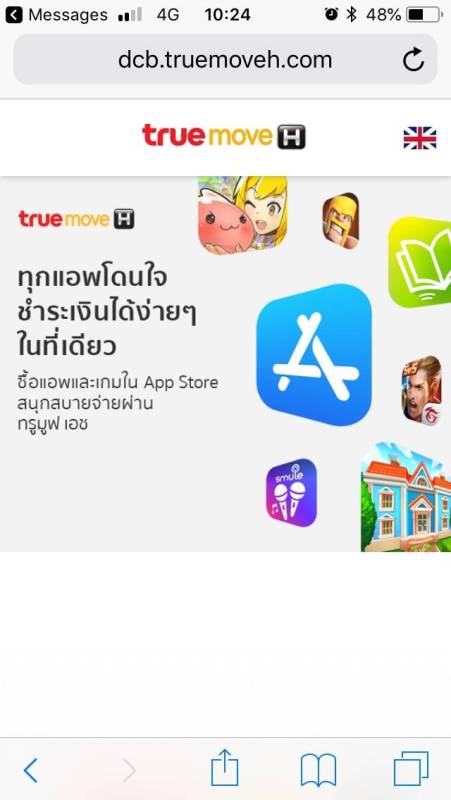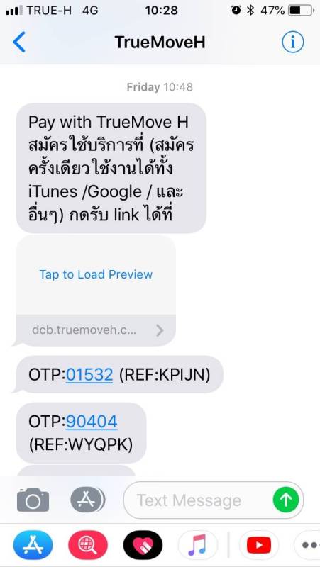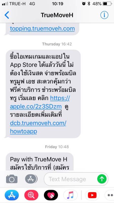 แต่ปกติไม่เคยซื้อนะครับ เพราะบัตรเคดิตไม่มี บัตรเดบิตก็ไม่ผูกไว้ใน Apple Account ส่วน ทรูวอลเลทที่เชื่อมบัญชีไว้ ก็ไม่มีเงินเพราะเติมเงินเข้าไปแค่ใช้ จะไม่มีเงินเหลือในบัญชีเกิน 10 20 บาท และแล้วอาทิตย์ที่แล้ว ก็ได้รับ SMS จากทรูว่ามีบริการจ่ายเงินค่าซื้อไอเทมเกมส์ใน App Store จ่ายพร้อมบิลทรูมันก็ดีครับ สะดวกดี ไม่กี่ตังค์สิ้นเดือนก็จ่ายพร้อมค่าโทรศัพท์ (SMS ตามรูปนี้ครับ)